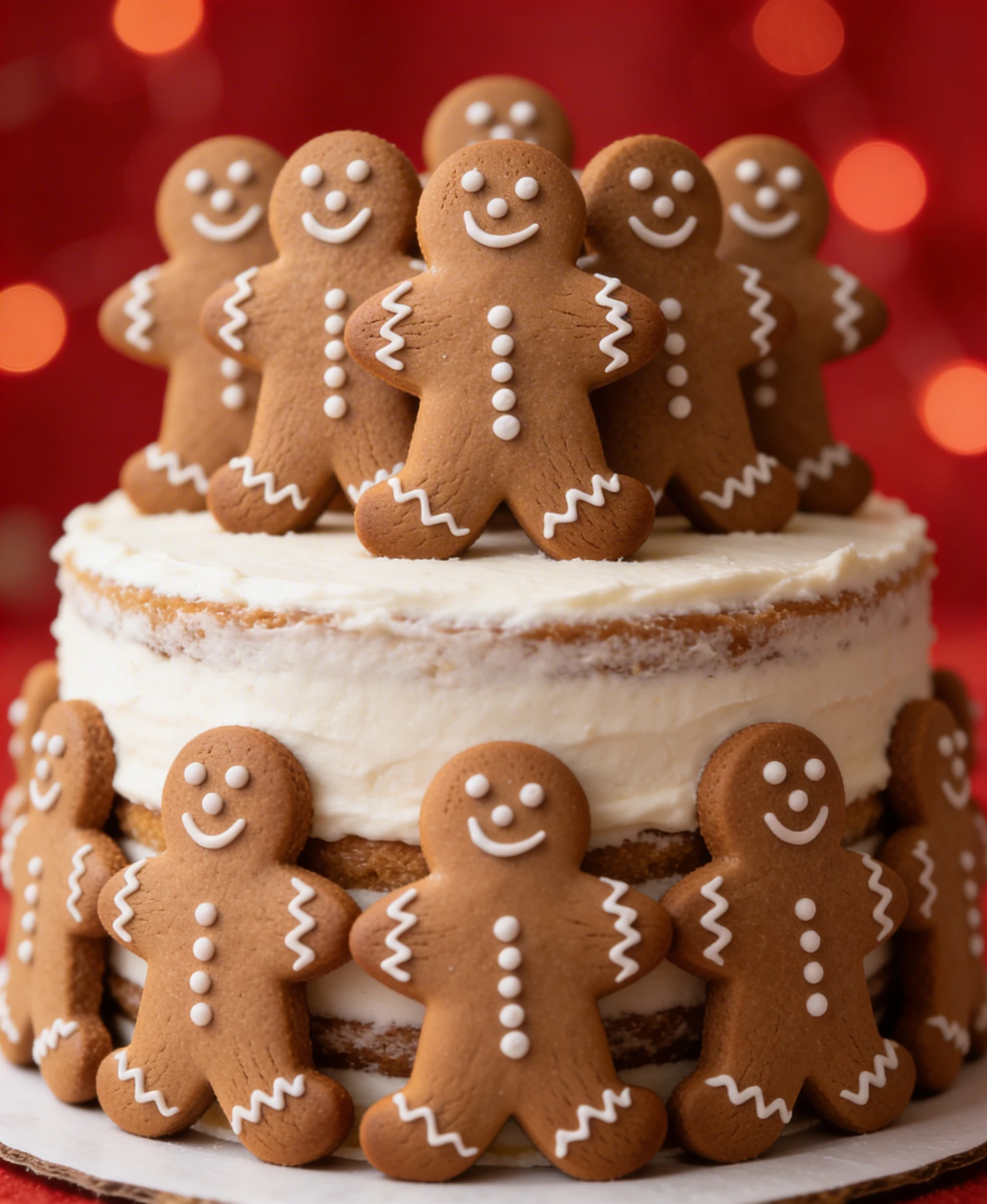 A festive cake adorned with gingerbread cookies and white frosting, set against a warm red background with bokeh lights.