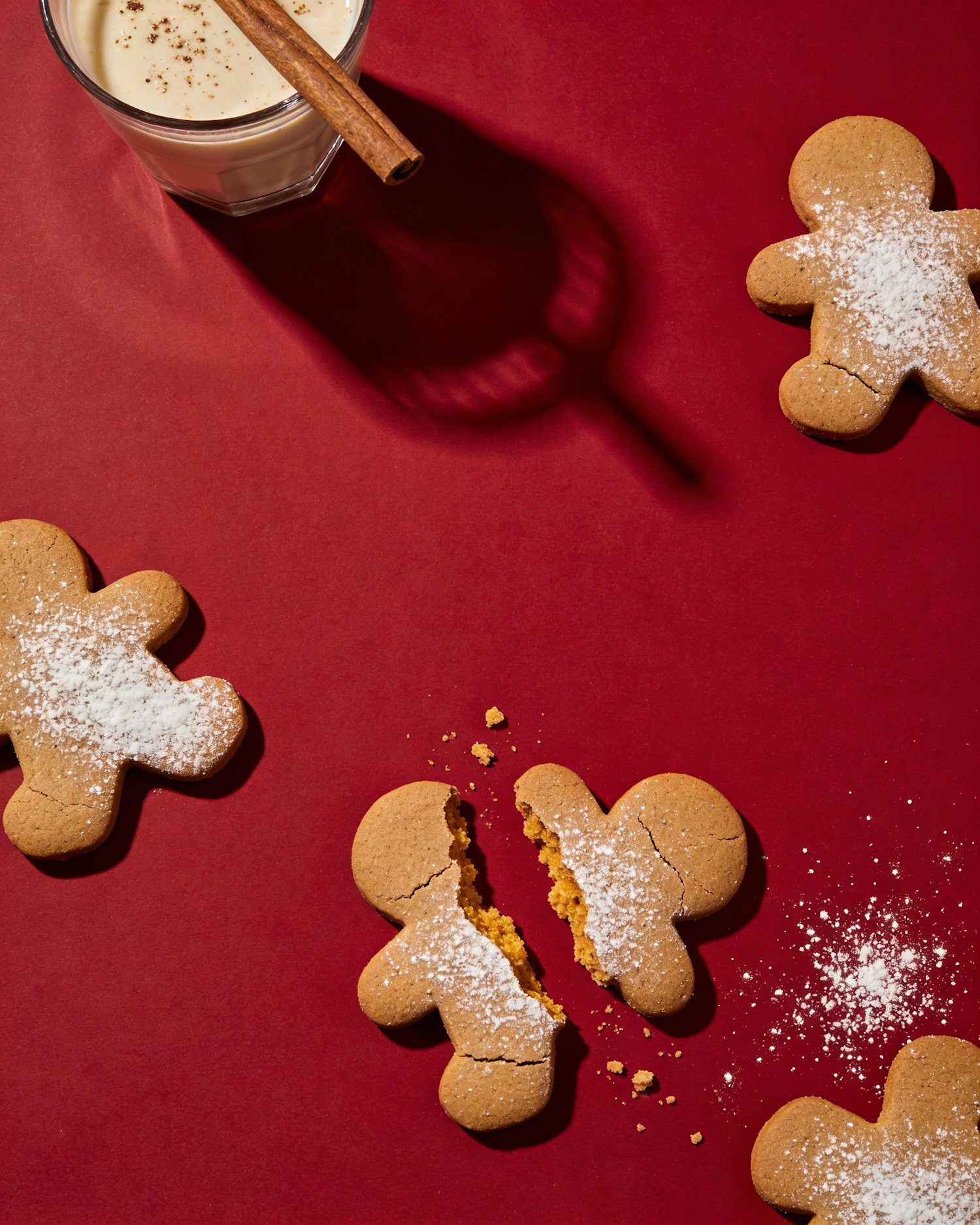 Editorial food photography, high realism, clean and graphic composition with strong negative space. The scene is shot from a strict top-down view (flat lay). The background is a smooth, matte, deep red surface, evenly colored, with a slightly velvety texture. In the upper left corner of the frame, partially cropped, sits a short glass filled with a creamy beige holiday drink (milk-based, lightly speckled with spices). A cinnamon stick emerges diagonally from the glass, pointing toward the center of the image. The glass casts a long, soft-edged shadow stretching diagonally downward toward the center-right of the frame, creating an elegant abstract shape. Scattered across the lower half and right side of the image are several gingerbread men cookies. They are medium brown, matte, with visible baked texture and slightly cracked edges. Each gingerbread man is lightly dusted with powdered sugar, creating soft white contrast against the red background. One gingerbread man near the lower center is broken in half, revealing a crumbly, golden-brown interior. The two halves are placed slightly apart, angled naturally. Small crumbs and powdered sugar are sprinkled loosely around the cookies, especially concentrated near the bottom right quadrant, becoming more sparse toward the center to preserve open space. The central upper area of the image remains intentionally empty, creating strong negative space suitable for typography or packaging placement. Lighting is bright, directional, and slightly angled from the upper left, producing crisp highlights and defined shadows while maintaining a clean, modern editorial look. Color palette is limited and bold: deep red background, warm brown cookies, soft white powdered sugar, and beige drink tones. No text, no packaging, no additional props, no decorations beyond what is described. Clean, minimal, high-end food photography with a festive yet modern mood.