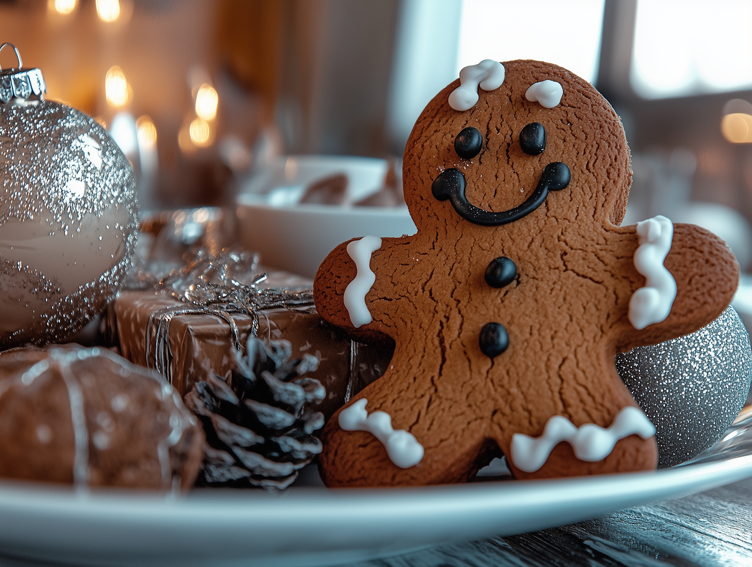 Festive gingerbread man with icing, surrounded by Christmas ornaments and gifts, set against a warm, glowing background.