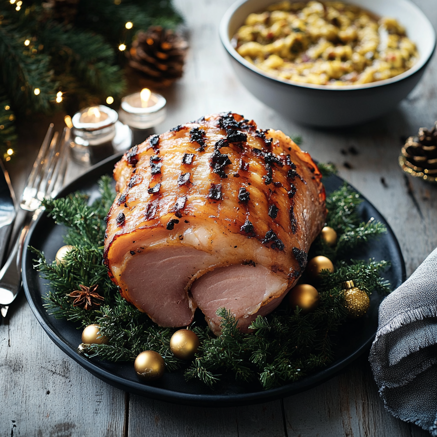 Festive glazed ham with golden ornaments and evergreens, paired with creamy mashed potatoes, set in a cozy holiday ambiance.