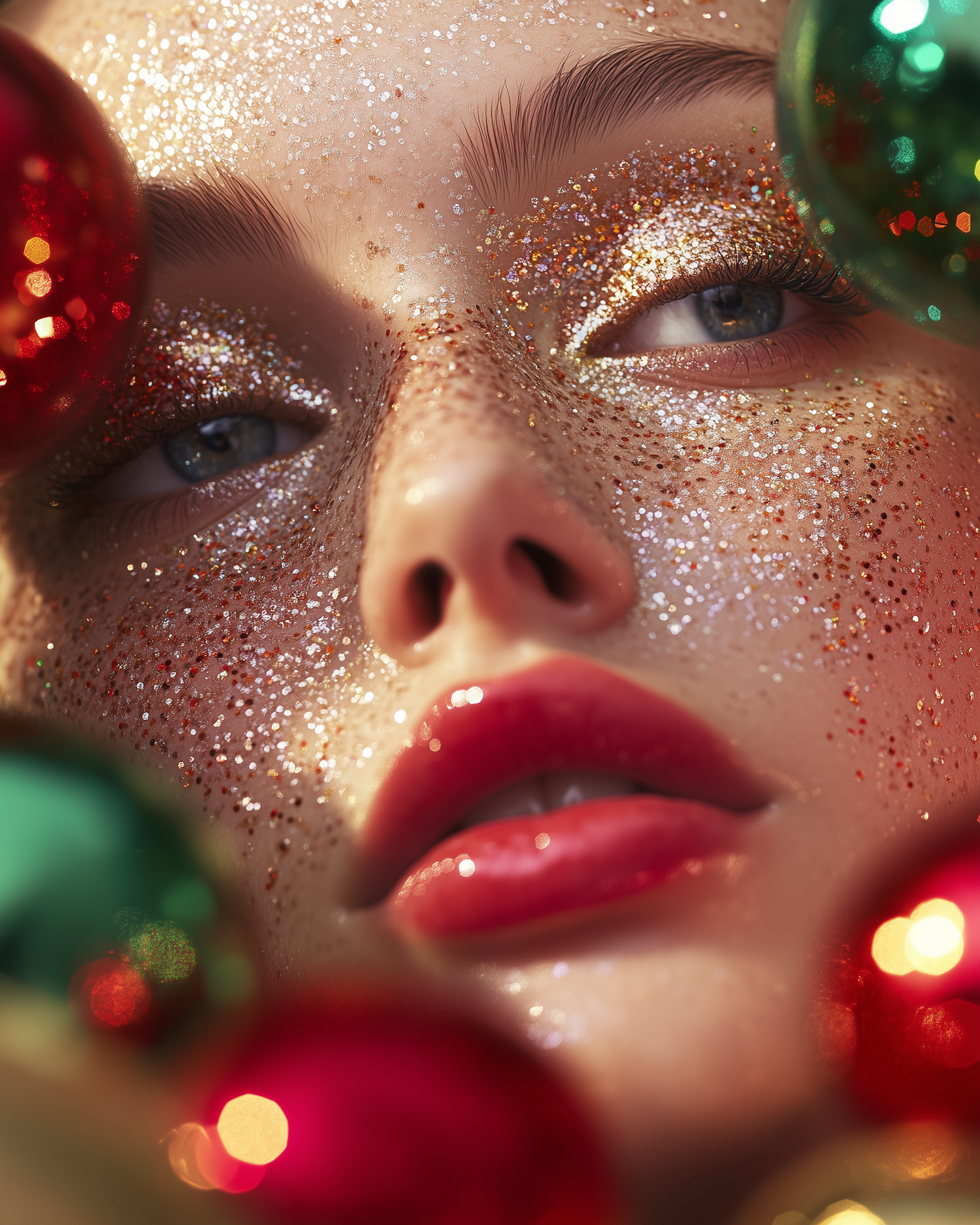 Close-up of a woman's glitter-adorned face with red lips, surrounded by festive Christmas ornaments in red and green.
