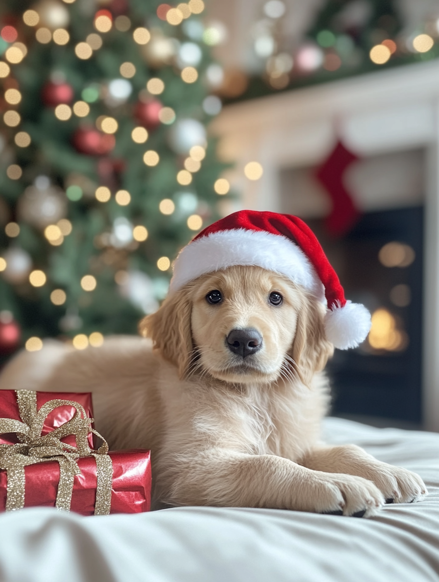 Adorable golden retriever puppy in a Santa hat with Christmas gifts and a decorated tree in the background.