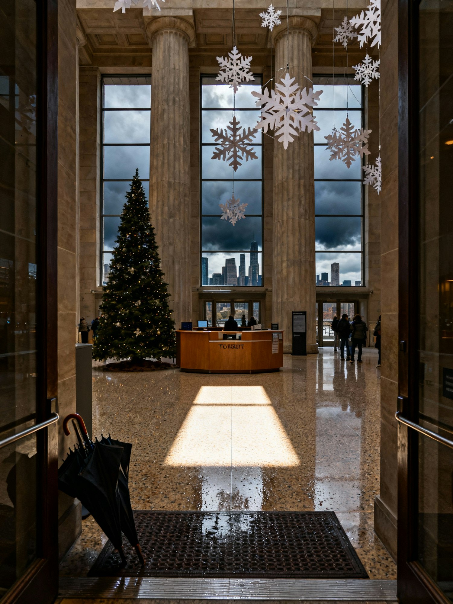City museum atrium Photorealistic: grand atrium with stone columns and a tall, tastefully decorated tree beside the ticket desk; paper snowflake mobiles high above; wet umbrellas at the entry mat; through clerestory windows: storm clearing over the skyline, a tight sun shaft painting a bright rectangle across terrazzo; natural micro-contrast, crisp stone detail. 24 mm, f/7.1, ISO 100, 1/250 s; CPL (tame glare on polished floors, deepen sky). Negative: cartoon saturation, bloom spill, mirrored people, watercolor mush, impossible shadows.