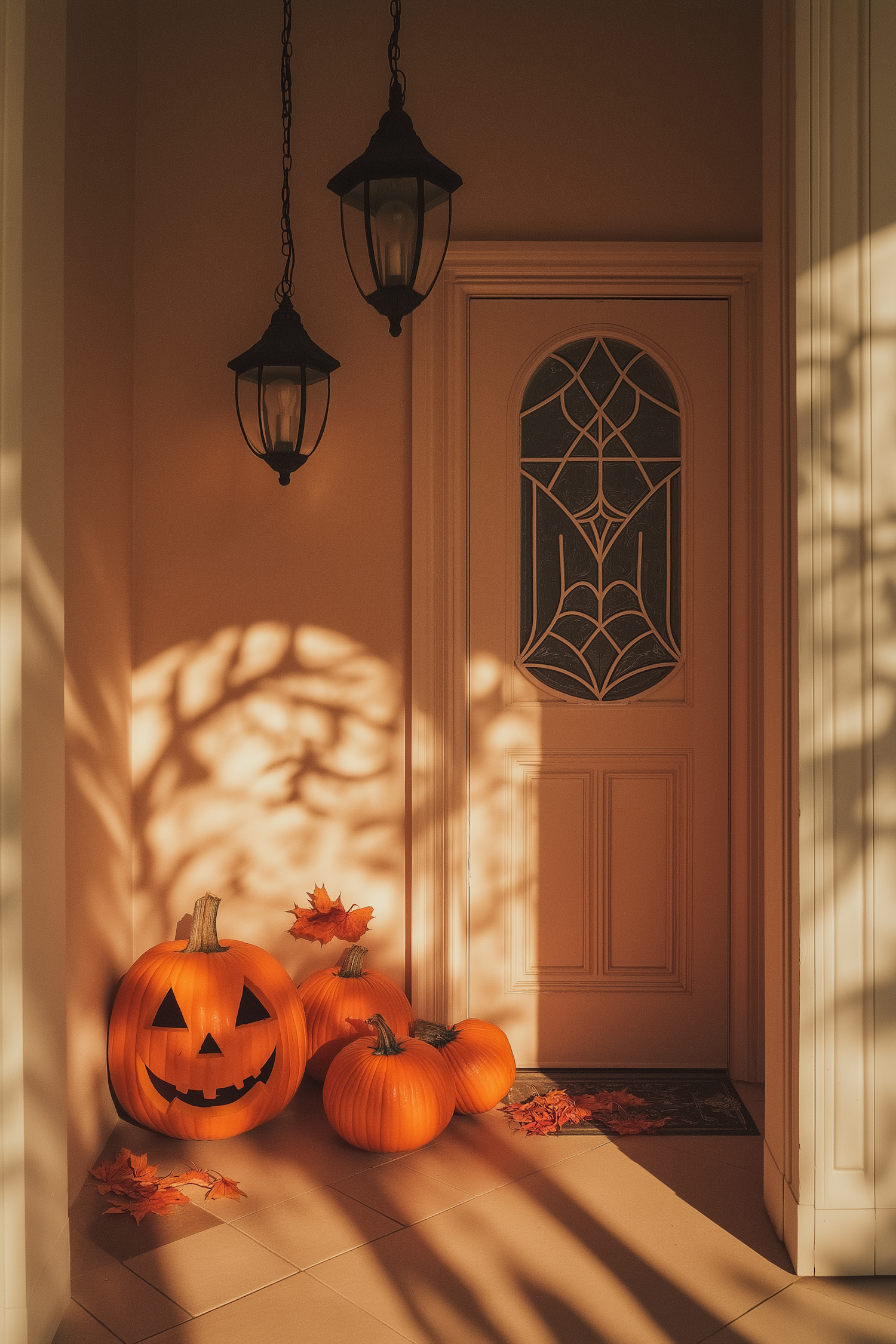 Cozy Halloween porch with pumpkins, autumn leaves, and lanterns casting shadows on a door with a spiderweb design.