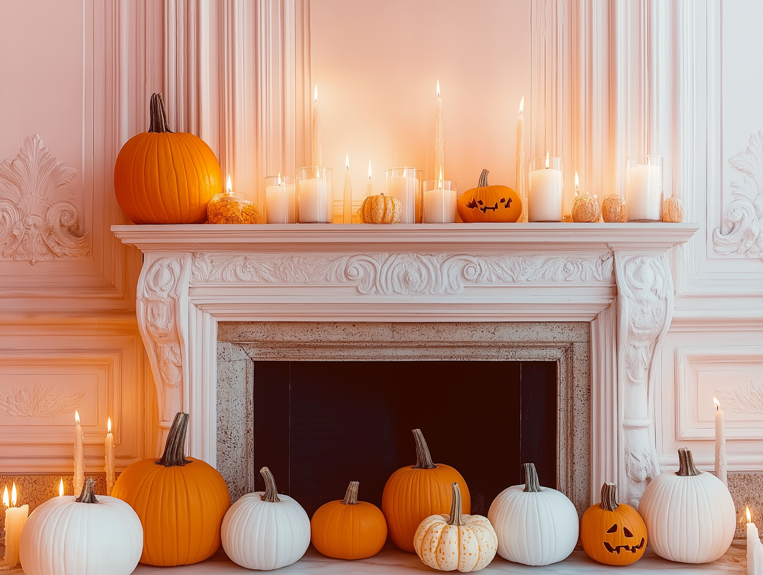 Elegant fireplace mantel with pumpkins and candles, creating a cozy autumnal and Halloween ambiance with warm lighting.