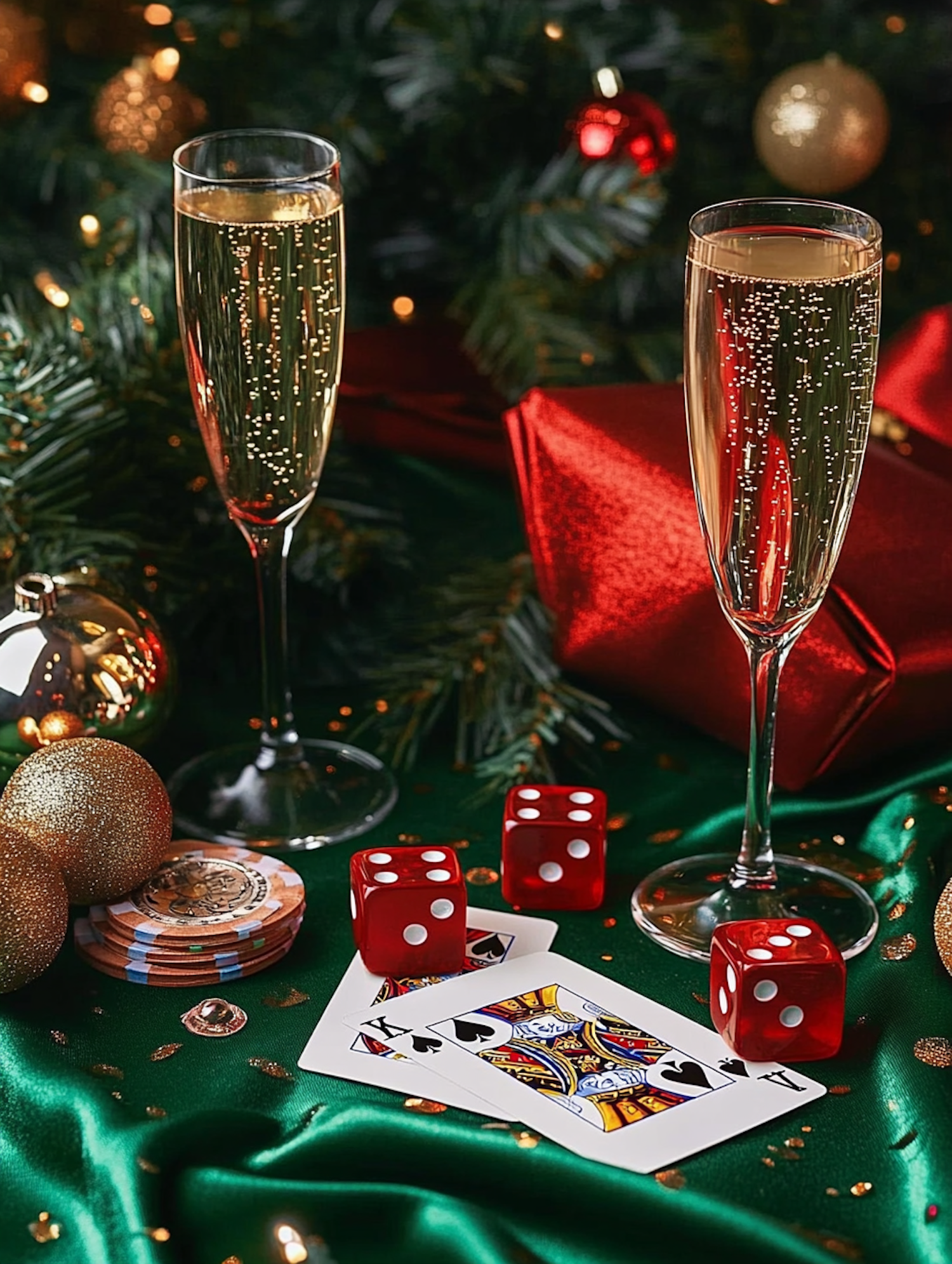 Festive scene with champagne, playing cards, dice, and Christmas decor, evoking holiday celebration and luxury.