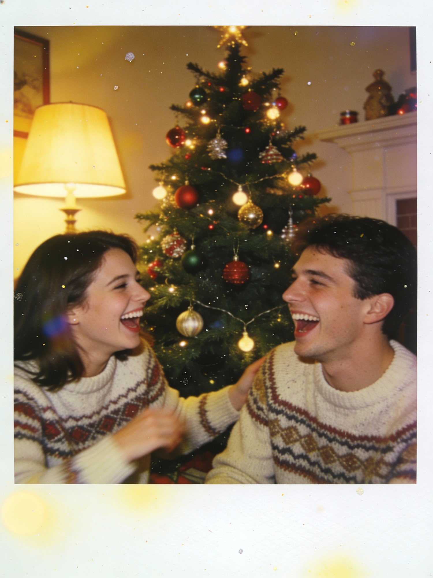 A candid 1987 consumer 35mm snapshot in color, captured in the same living room with the same Christmas tree placement and same camera framing. Warm tungsten lighting, classic ornaments glowing behind them. A young couple ( woman and man ) laughs openly near the tree, one leaning toward the other mid-joke, spontaneous and unposed. Faces remain clear, minimal blur only on a moving arm. Cozy vintage sweaters, cheerful holiday energy. Not cinematic, not modern, not HDR. Scanned drugstore print look: slight color fade, yellowed whites, soft focus, halation around lights, visible 35mm grain, light vignette, dust specks.