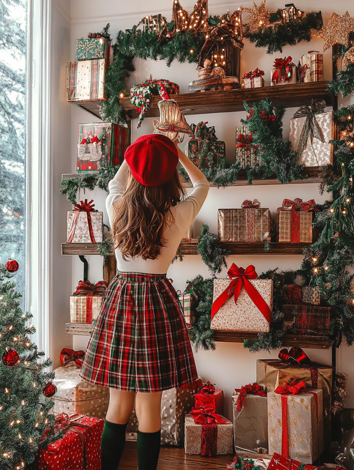 Festive holiday scene with a woman decorating shelves with Christmas gifts and garlands, wearing a red beret and plaid skirt.