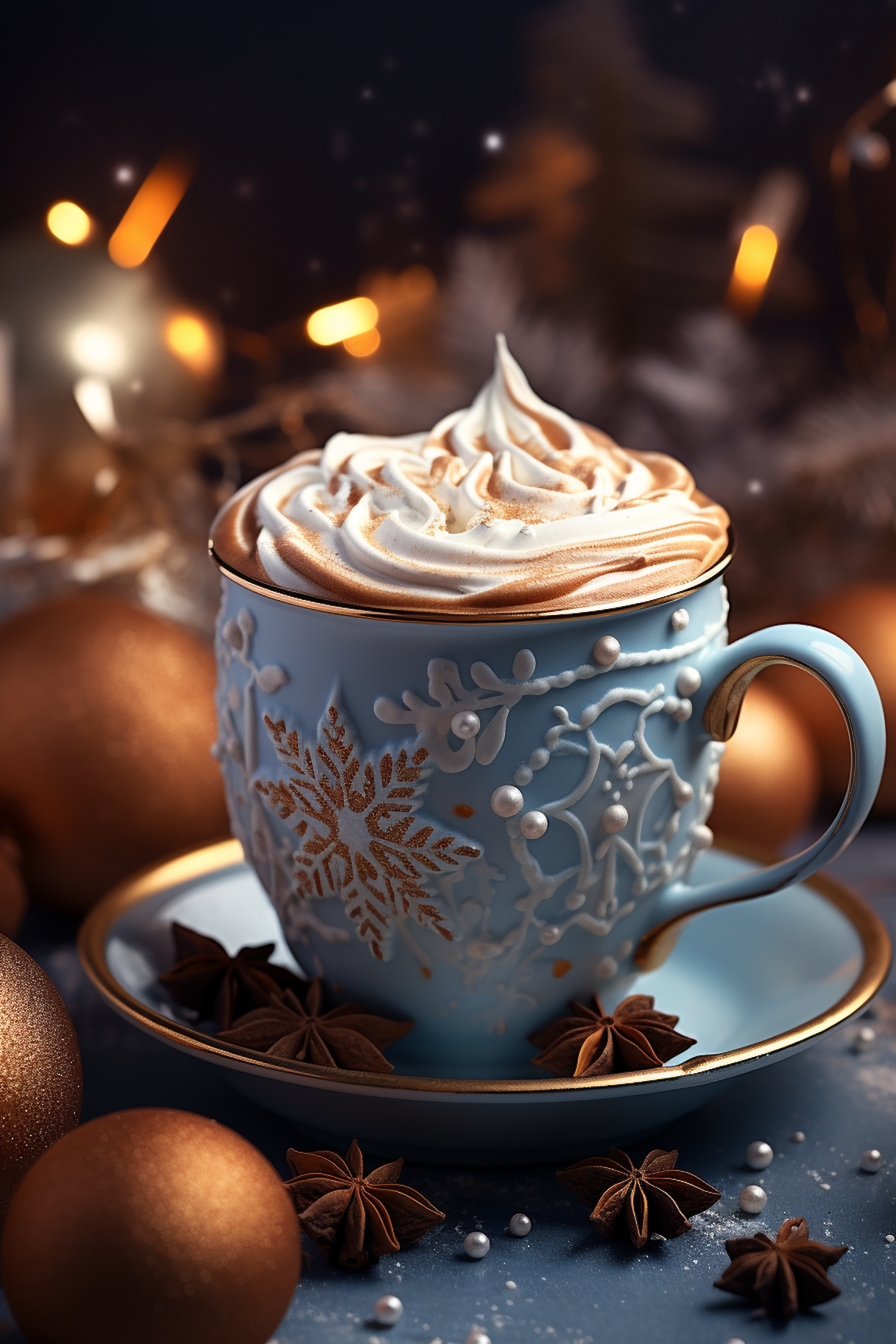 Elegant blue cup with snowflake design, topped with whipped cream and cinnamon, surrounded by star anise and warm festive lights.