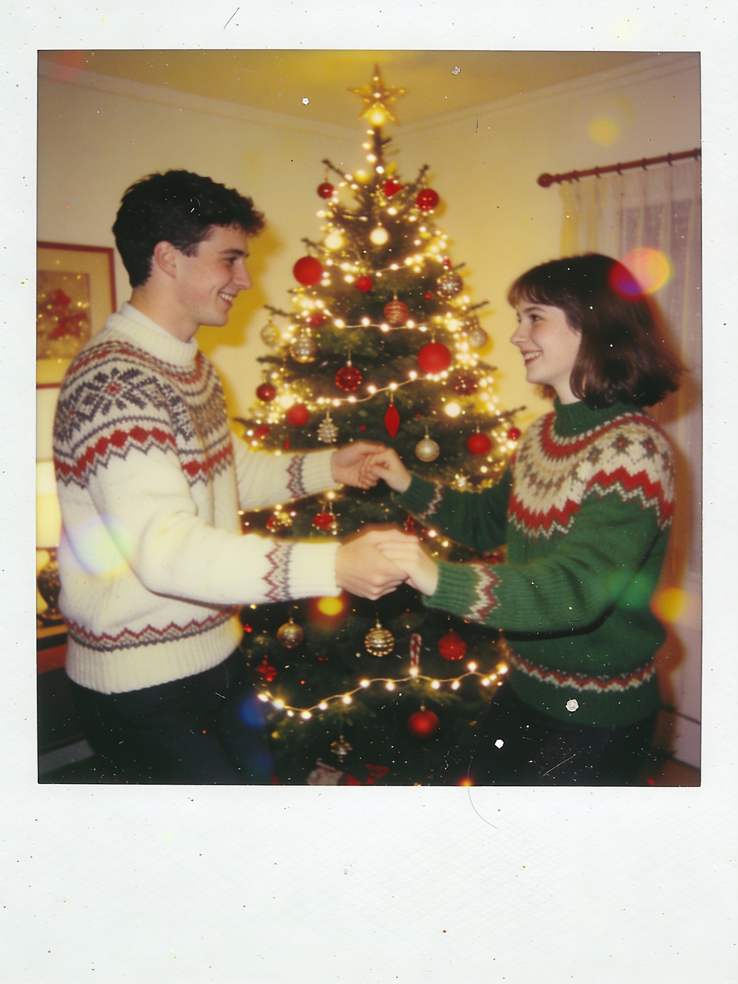 Two people in festive sweaters share a joyful moment in front of a glowing Christmas tree adorned with ornaments and lights.