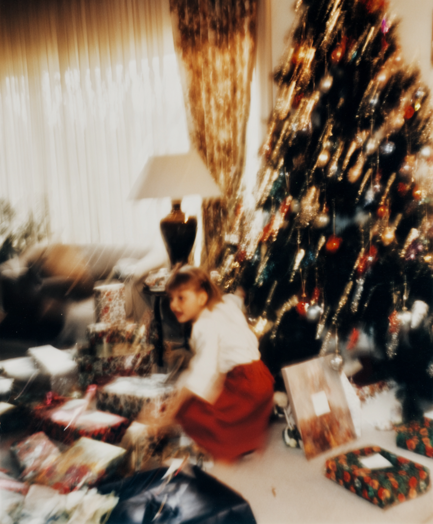 A nostalgic Christmas scene with a child surrounded by gifts and a decorated tree, capturing the joy and warmth of the holiday season.
