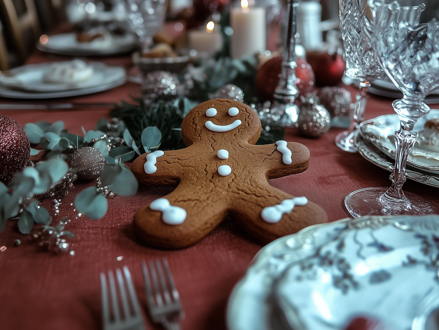 Festive table with gingerbread cookie, crystal glasses, and Christmas decor on a red tablecloth, creating a cozy holiday atmosphere.