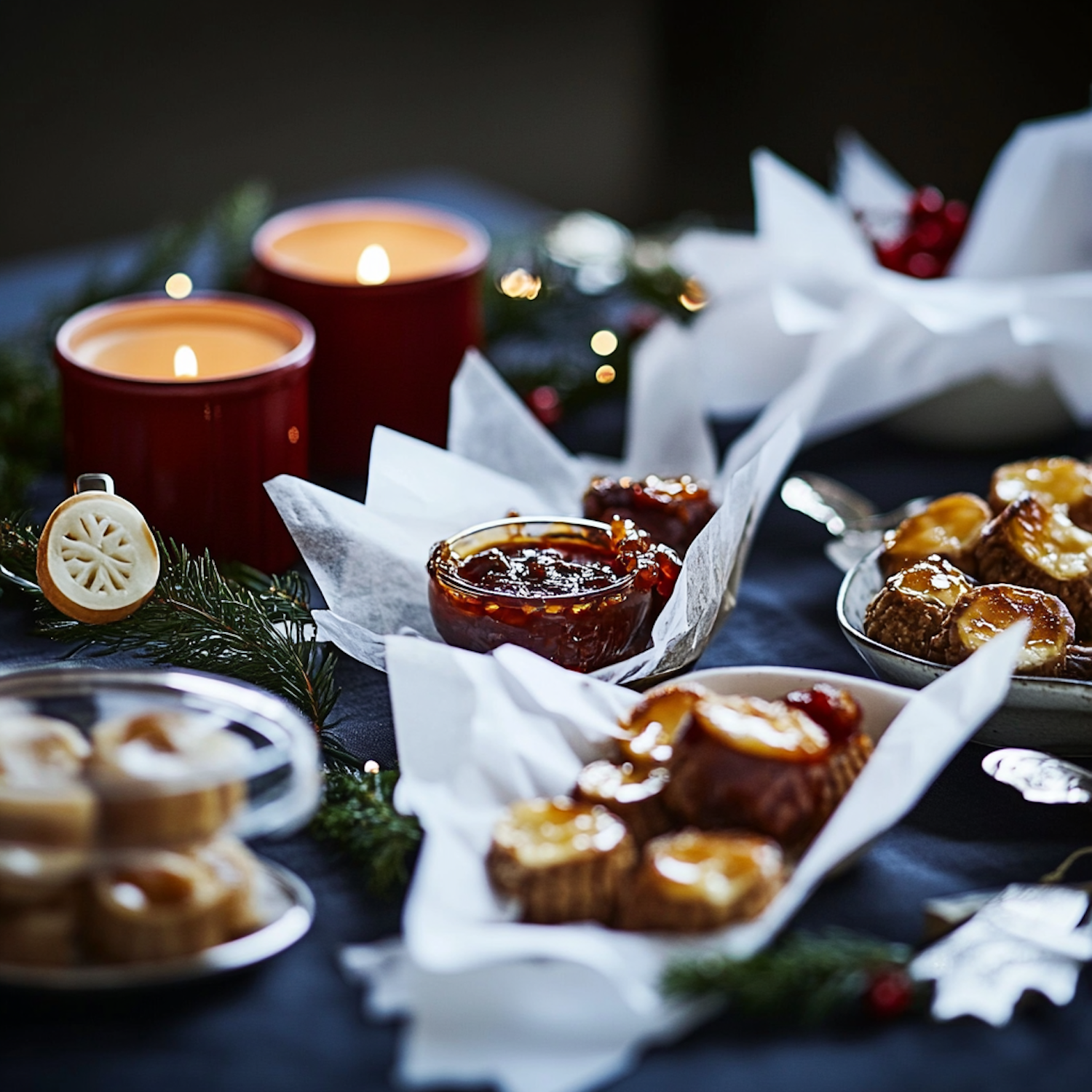 Festive holiday table with pastries, red candles, and evergreen decor, creating a warm and inviting atmosphere.