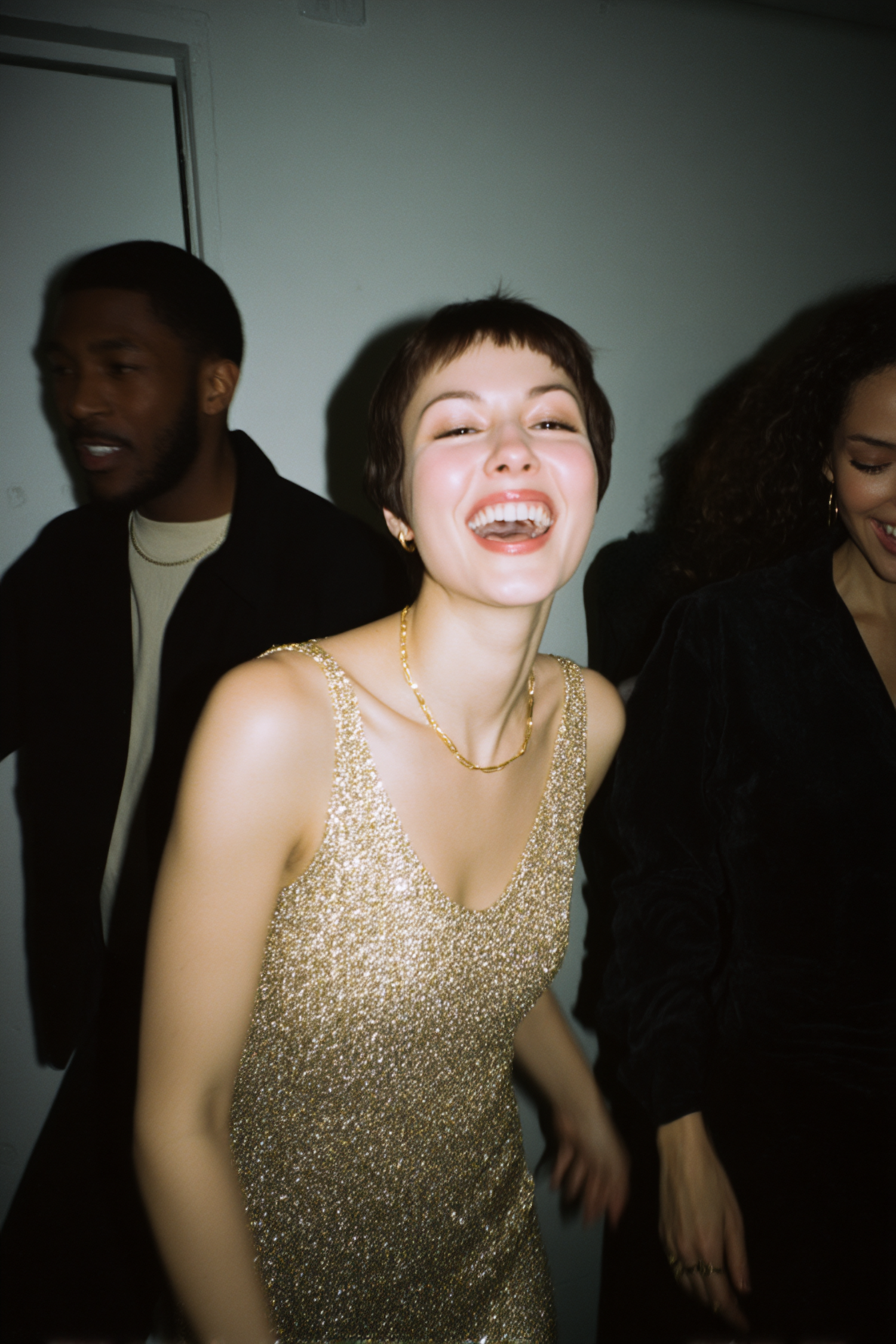 A joyful woman in a glittering gold dress laughs with friends in a dimly lit room, capturing a fun and festive moment.