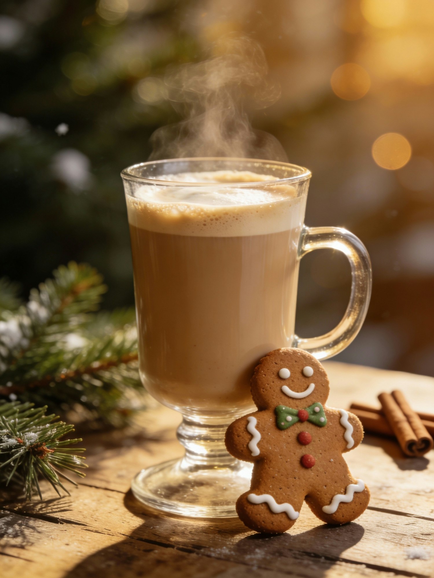 A warm latte in a glass mug with a festive gingerbread cookie, set on a rustic table with holiday decor and soft lighting.