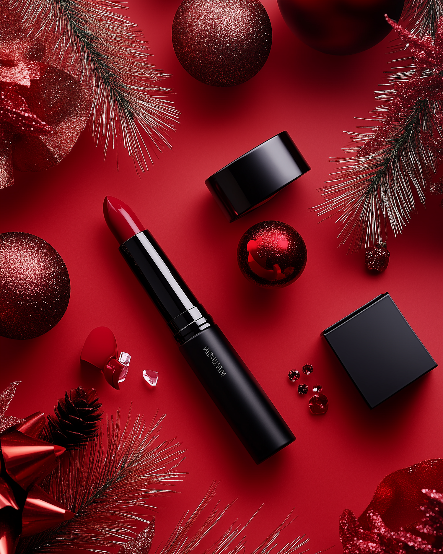 Luxurious red lipstick surrounded by festive decorations, baubles, and pine branches on a rich red background.