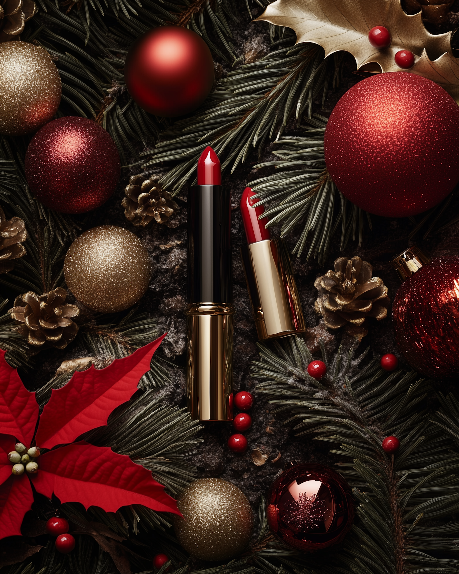 Luxurious red lipstick amidst festive Christmas decorations with red and gold baubles, pine branches, and holly berries.