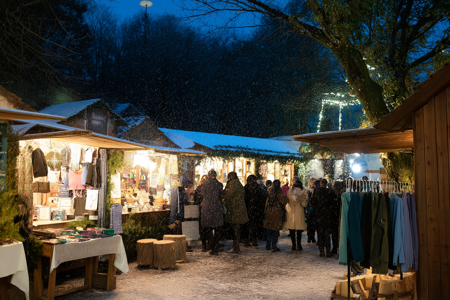 A festive, snowy Christmas market glowing with warm light, filled with cheerful, warmly dressed visitors exploring holiday stalls.