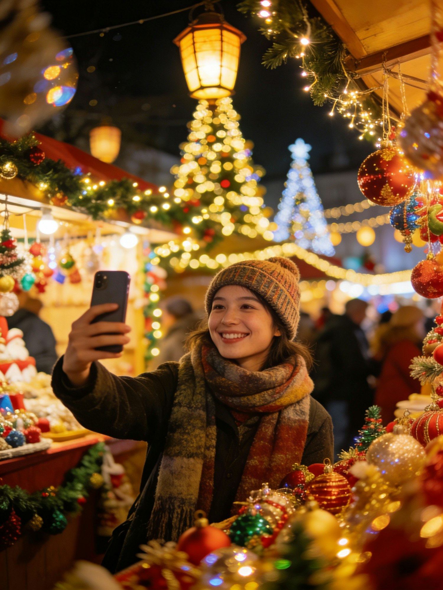 A cheerful woman takes a selfie at a vibrant Christmas market, surrounded by festive lights, ornaments, and a glowing holiday tree.