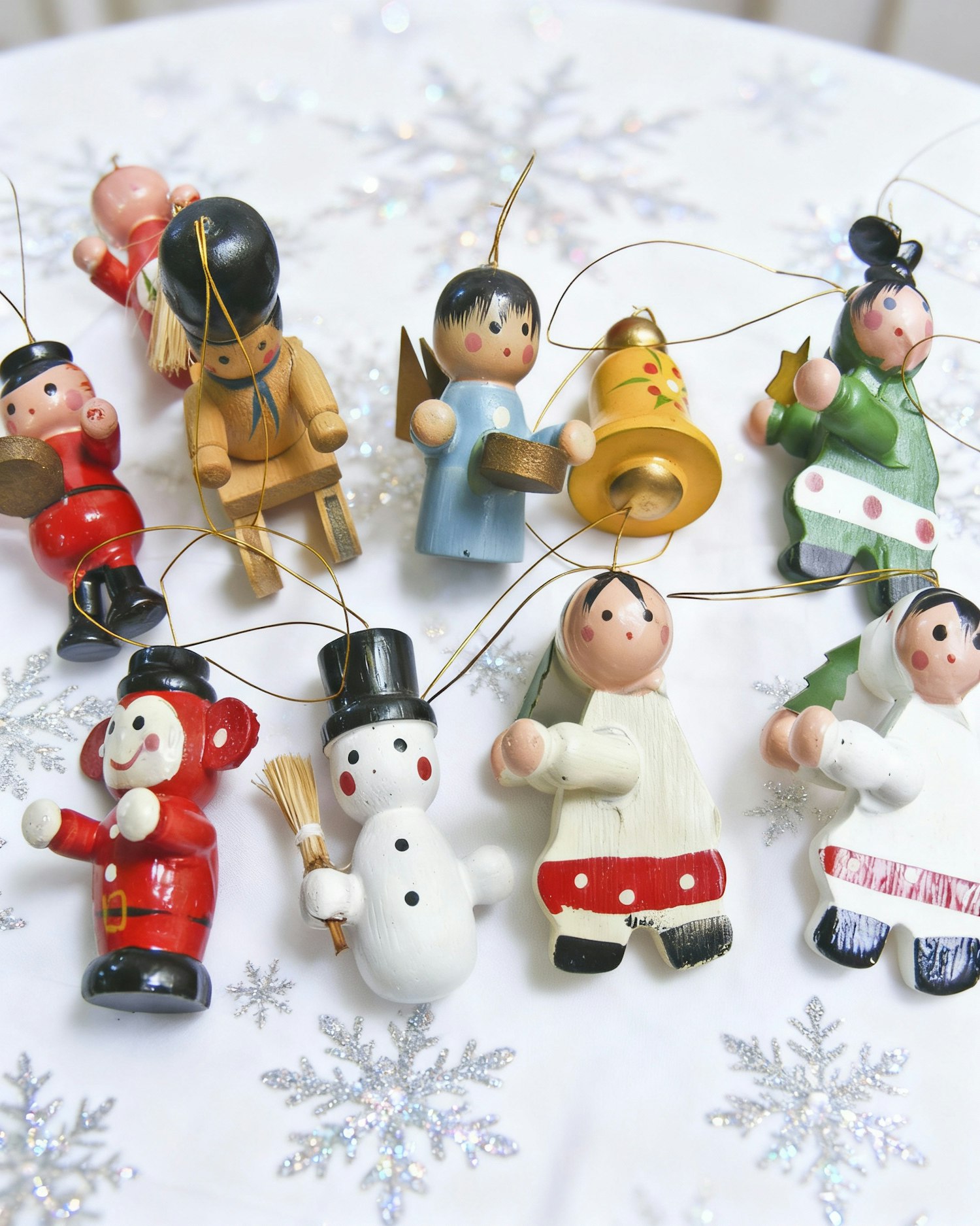 A festive arrangement of colorful wooden Christmas ornaments on a glittery snowflake-patterned surface, perfect for holiday decor.