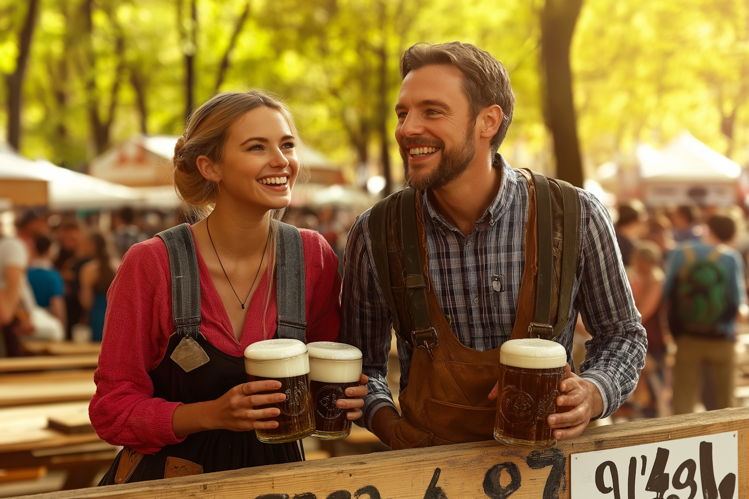 Smiling couple in traditional attire enjoying beer at an outdoor festival, surrounded by a lively crowd and sunlit trees.
