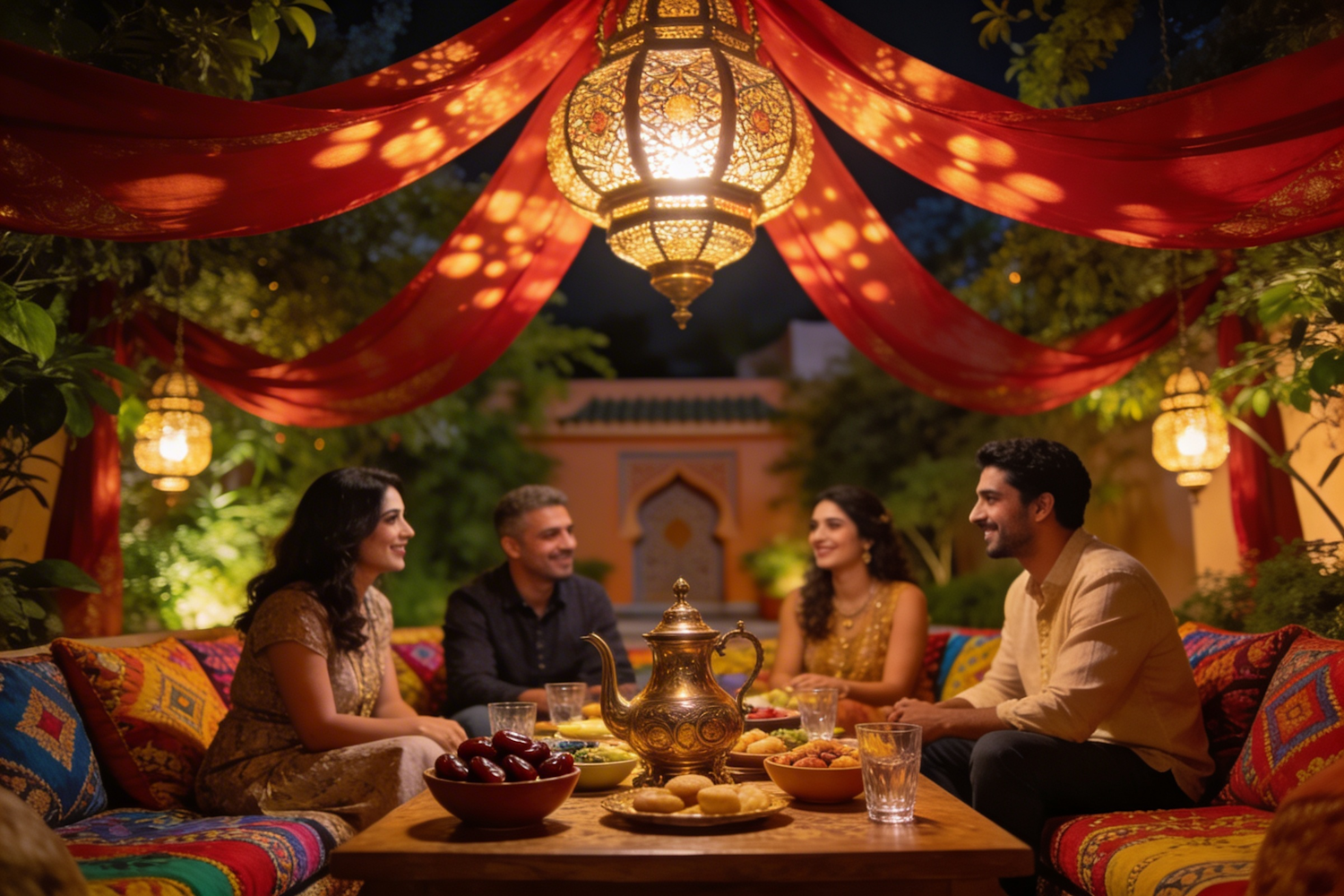 A joyful outdoor Moroccan iftar scene with friends and family gathered on cushions beneath hanging lanterns. A low table holds Ramadan dishes, dates, and tea. Soft night lighting, red drapes, and brass accents create a rich, celebratory atmosphere.