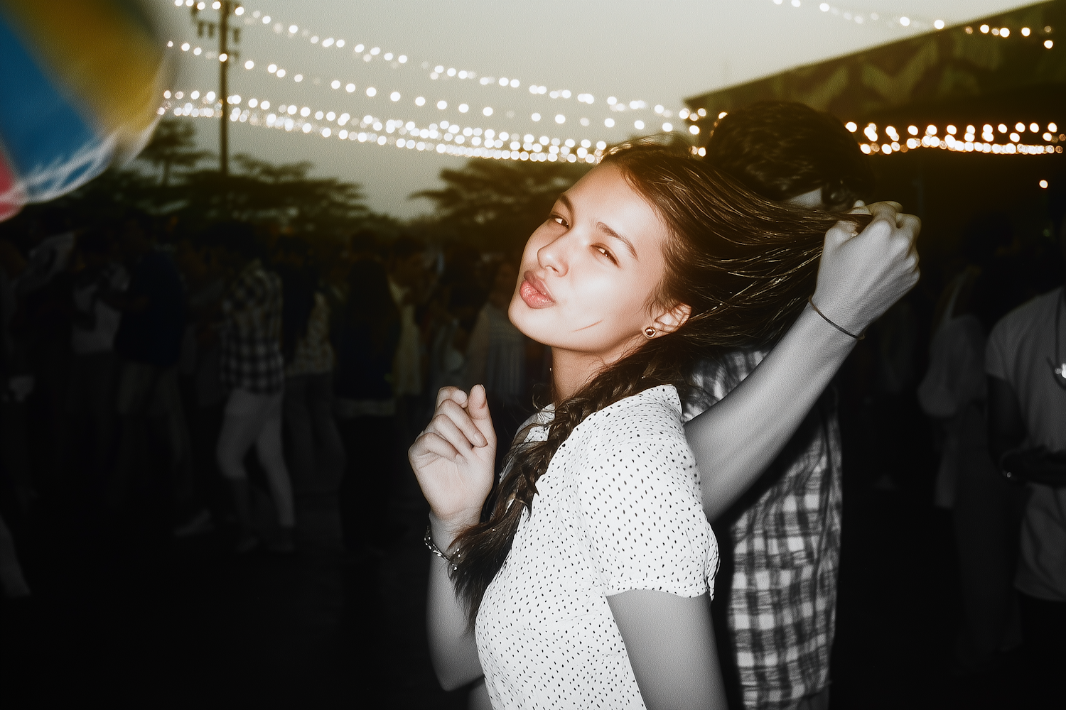 A cheerful young woman at an outdoor event, posing playfully with string lights and a lively crowd in the background.