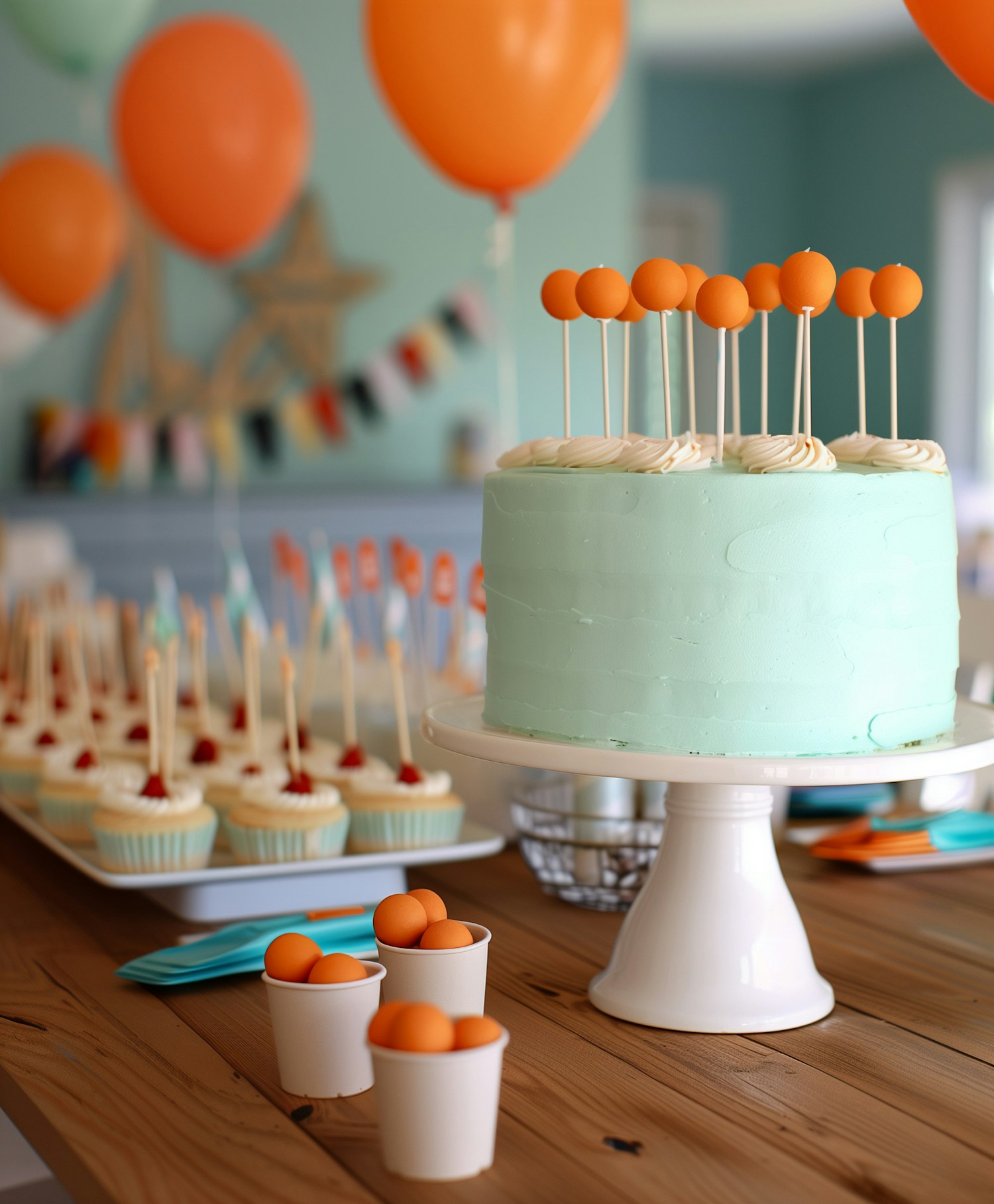 Festive cake with orange decorations, surrounded by cupcakes and balloons in a colorful party setting.