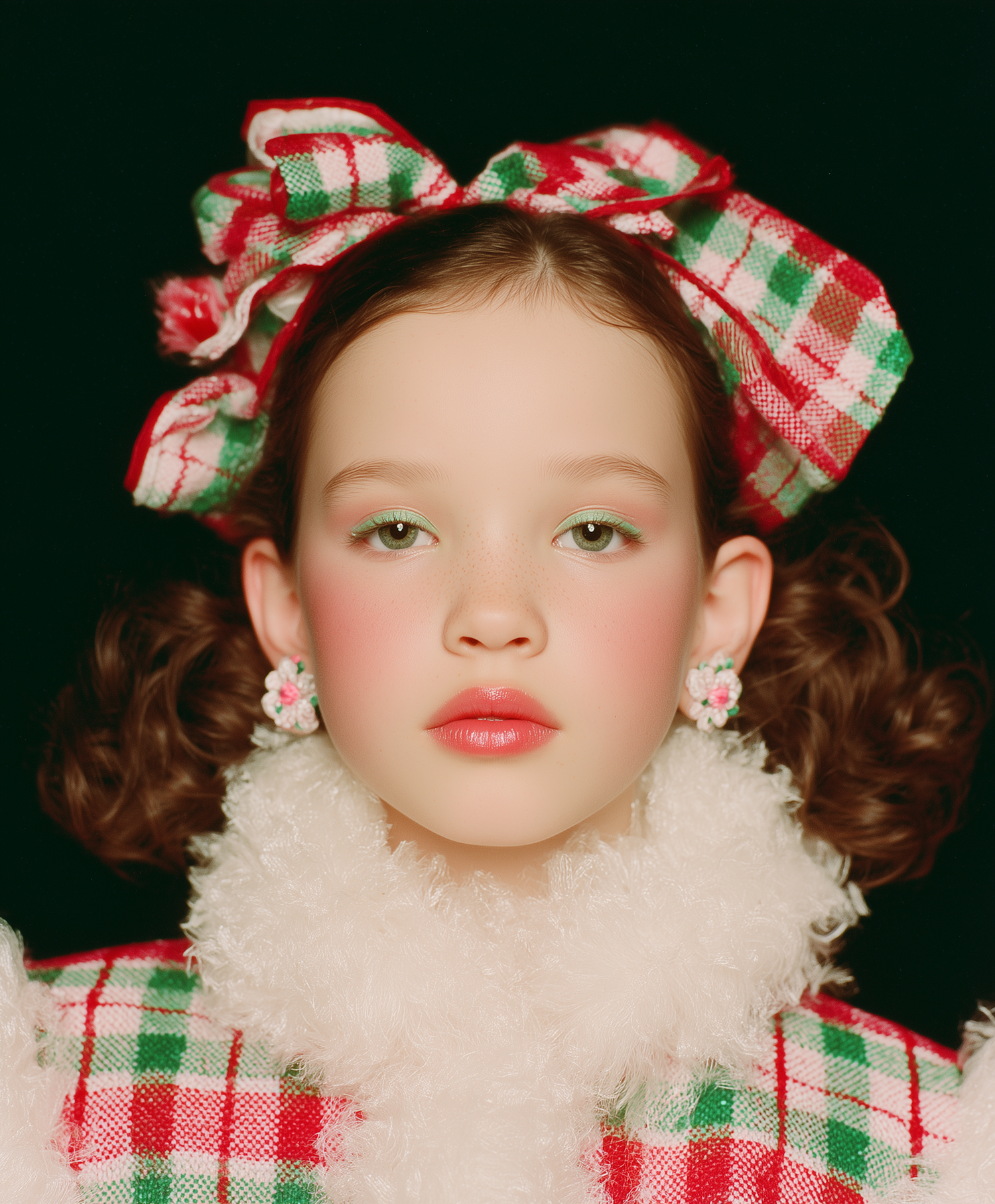 A young person in festive plaid attire with a fluffy scarf and a large bow, set against a dark background, creating a striking contrast.