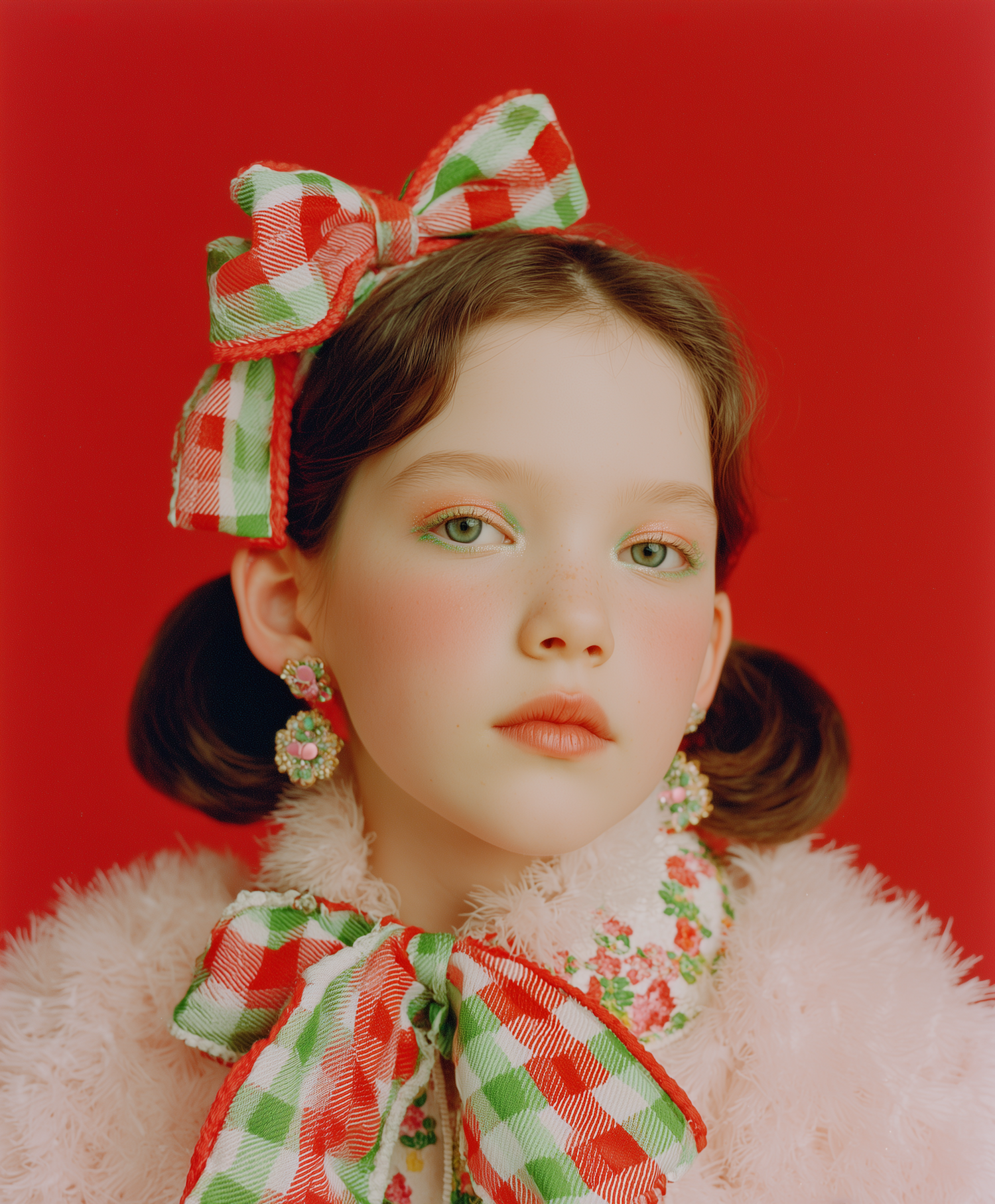 A vibrant portrait of a young individual with a festive red and green bow, styled hair, and colorful attire against a red background.