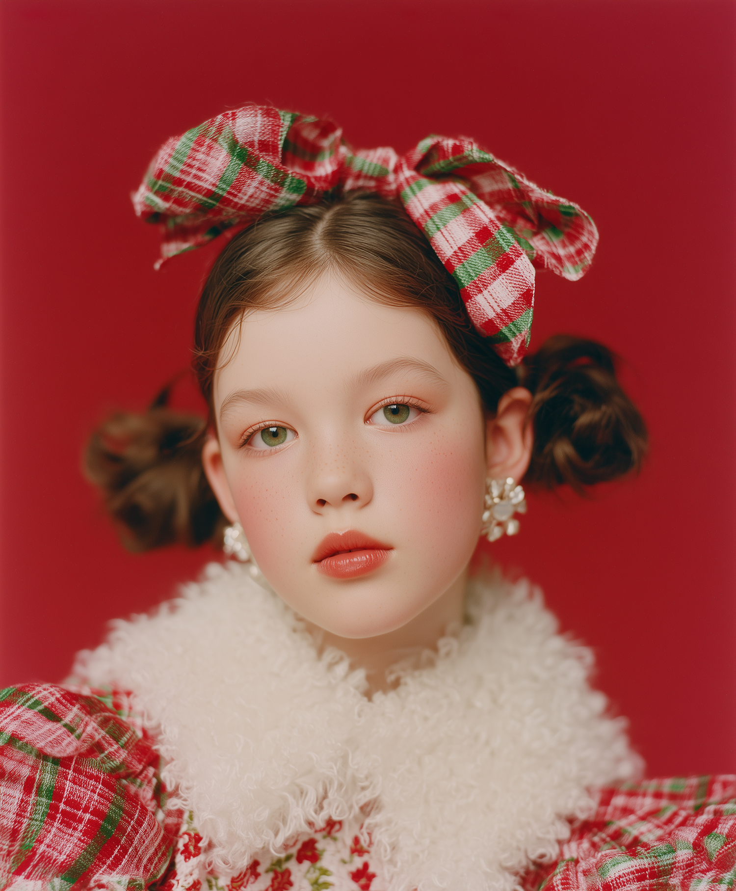 A festive portrait of a young individual with a plaid bow, fluffy collar, and vibrant red background, evoking a cheerful holiday spirit.