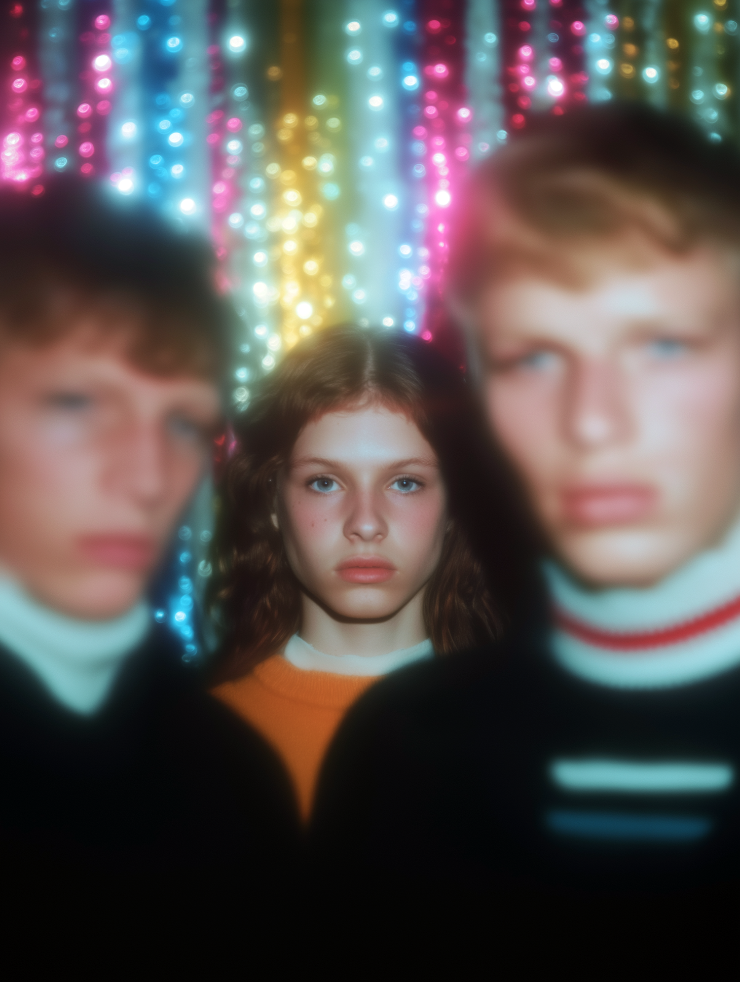 A vibrant portrait with a central figure in focus against a colorful, shimmering background, flanked by two blurred individuals in the foreground.