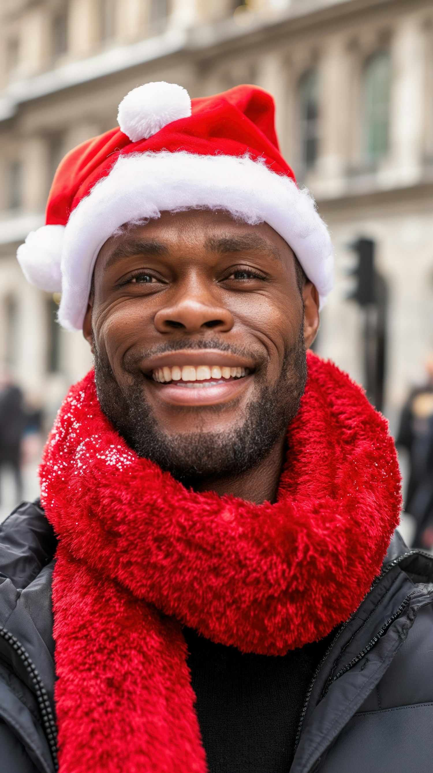 Smiling man in Santa hat and red scarf, enjoying a festive city atmosphere. Perfect for holiday-themed content.