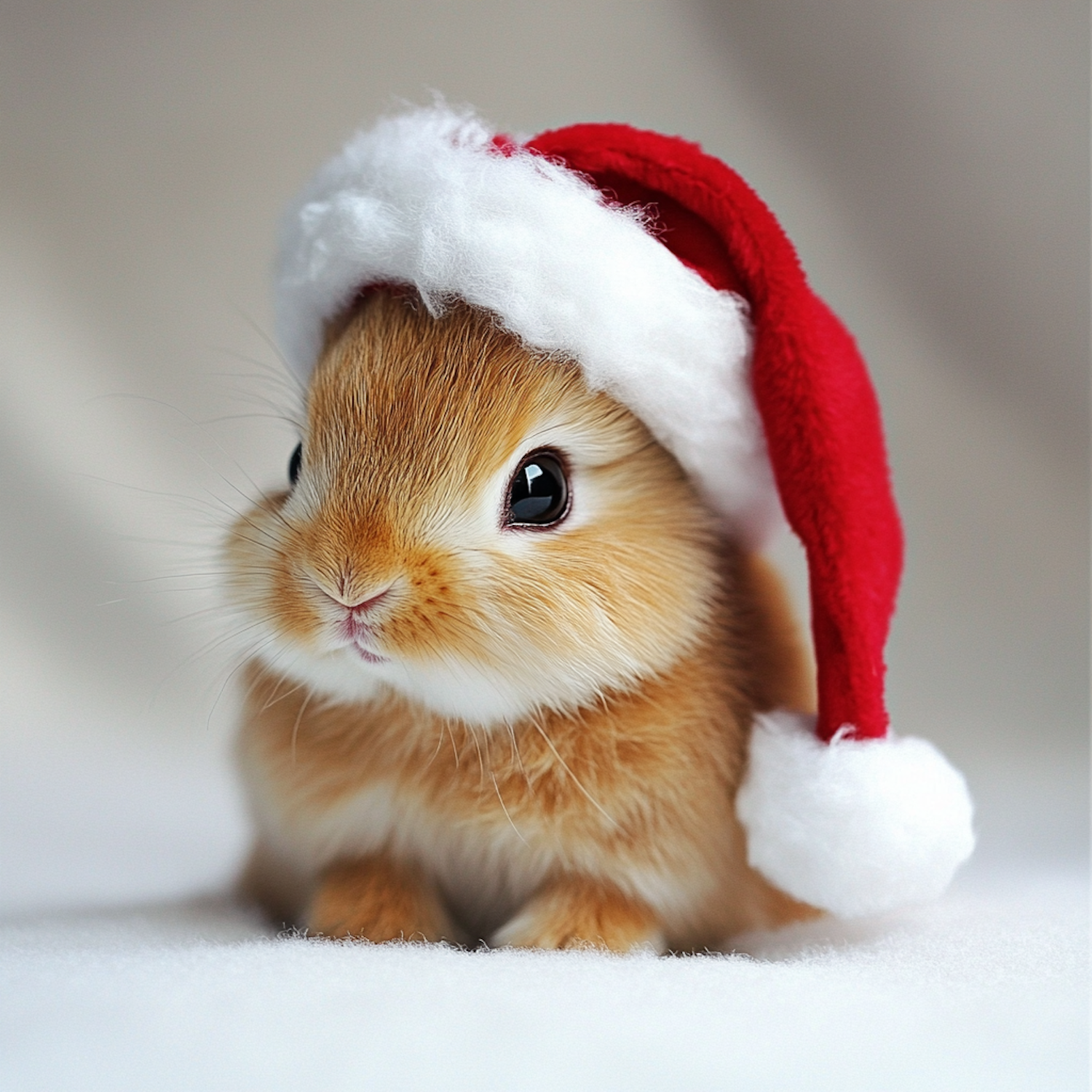 Adorable brown rabbit wearing a Santa hat, exuding festive charm and cuteness against a soft white background.