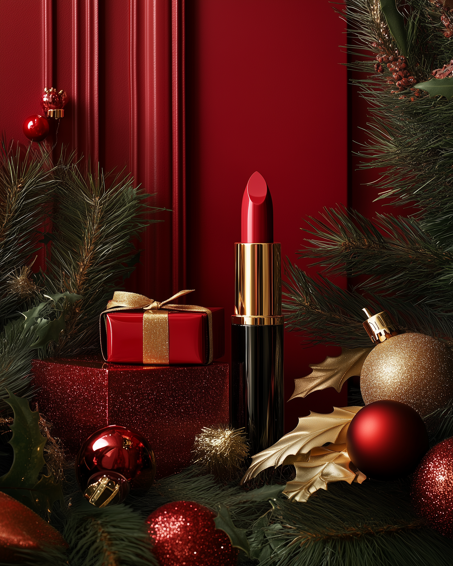 Festive red lipstick with gold accents surrounded by holiday ornaments and greenery, creating a luxurious Christmas vibe.