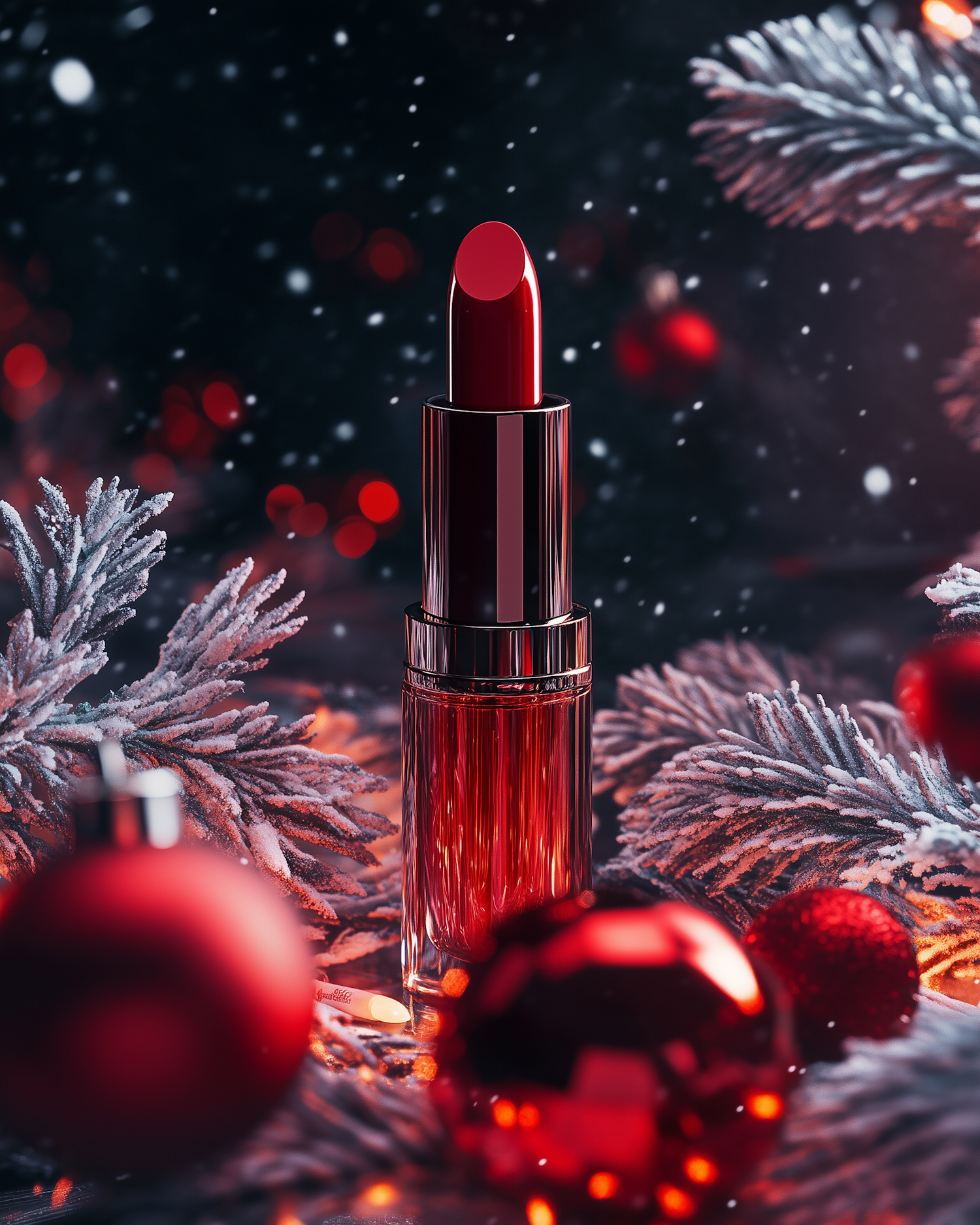 Festive red lipstick surrounded by frosted pine branches and ornaments, with glowing lights and falling snow for a holiday vibe.