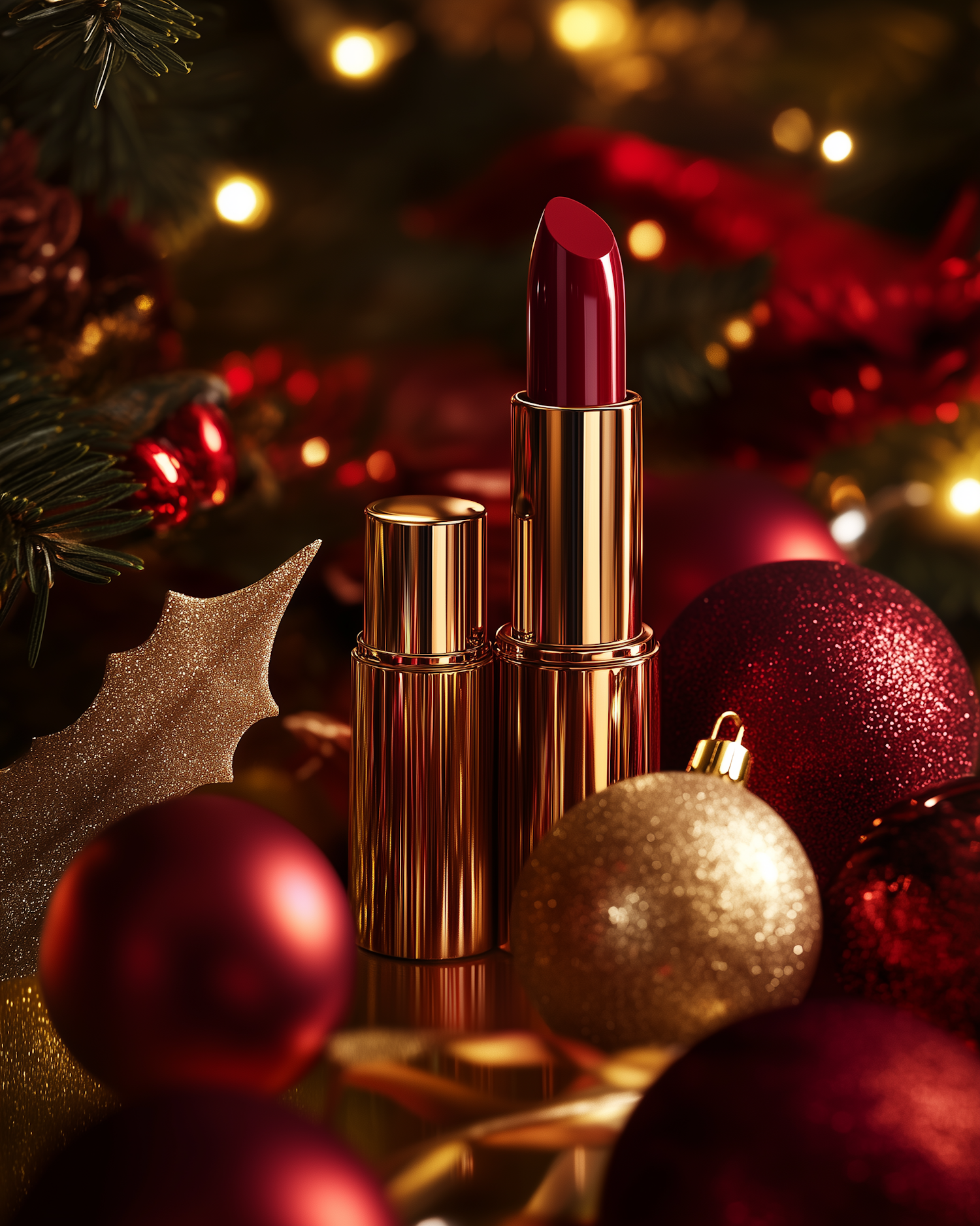 Luxurious red lipstick with gold casing amidst festive Christmas decorations and warm lights, exuding holiday elegance.