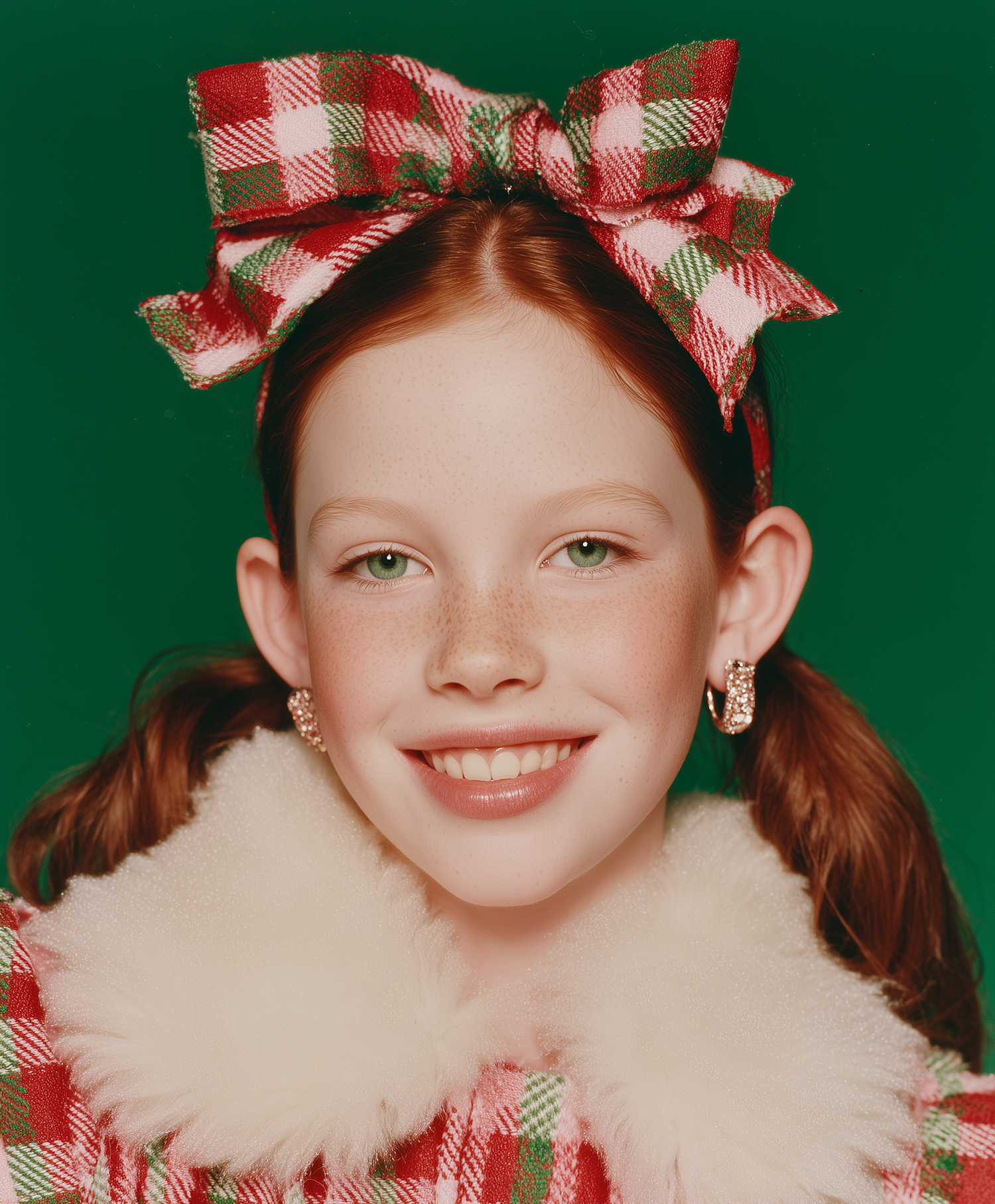 A cheerful young girl with red hair and a festive plaid bow smiles against a green background, radiating holiday spirit.