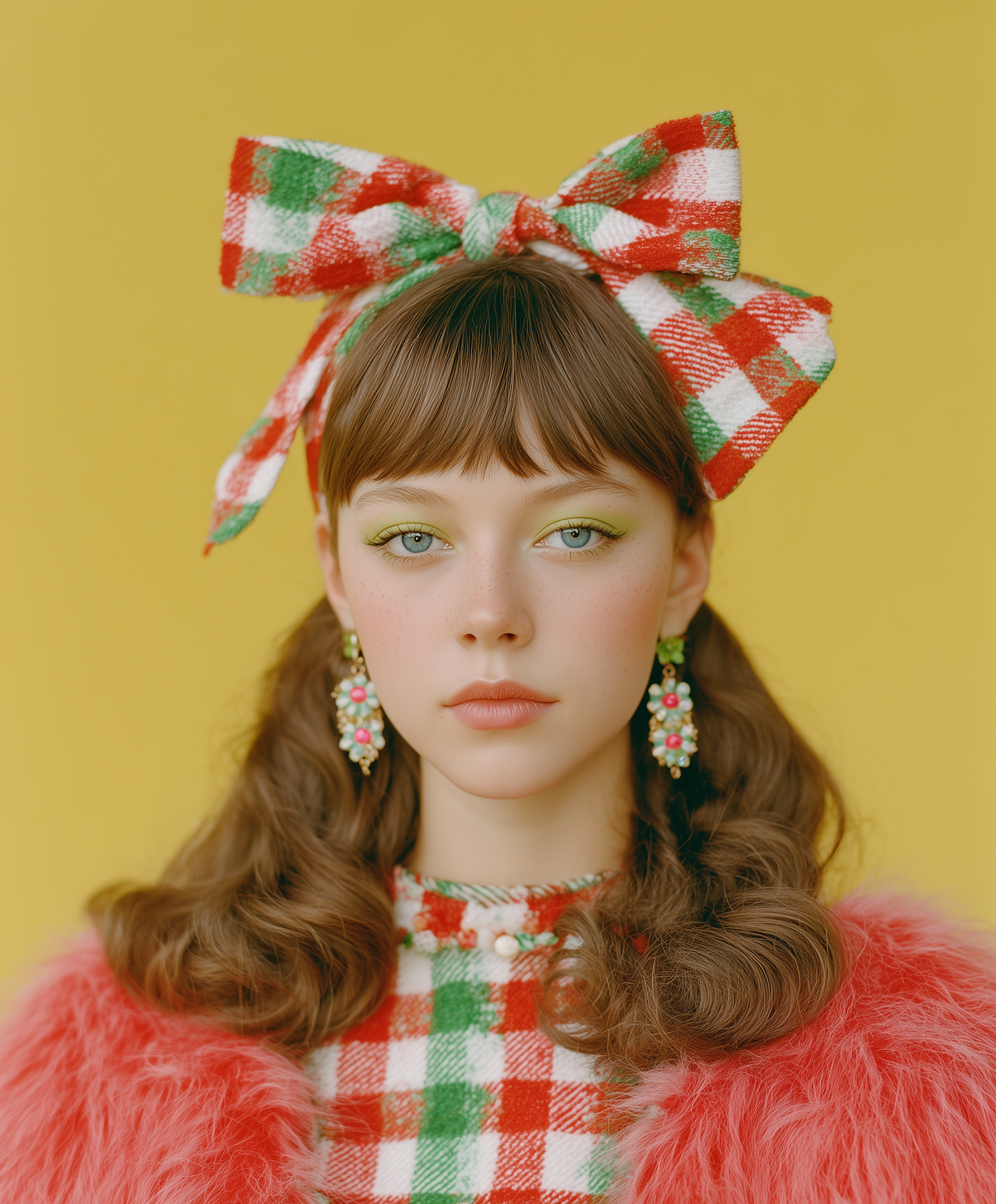 A vibrant portrait of a woman with a plaid bow, colorful earrings, and a pink fur jacket against a yellow background.