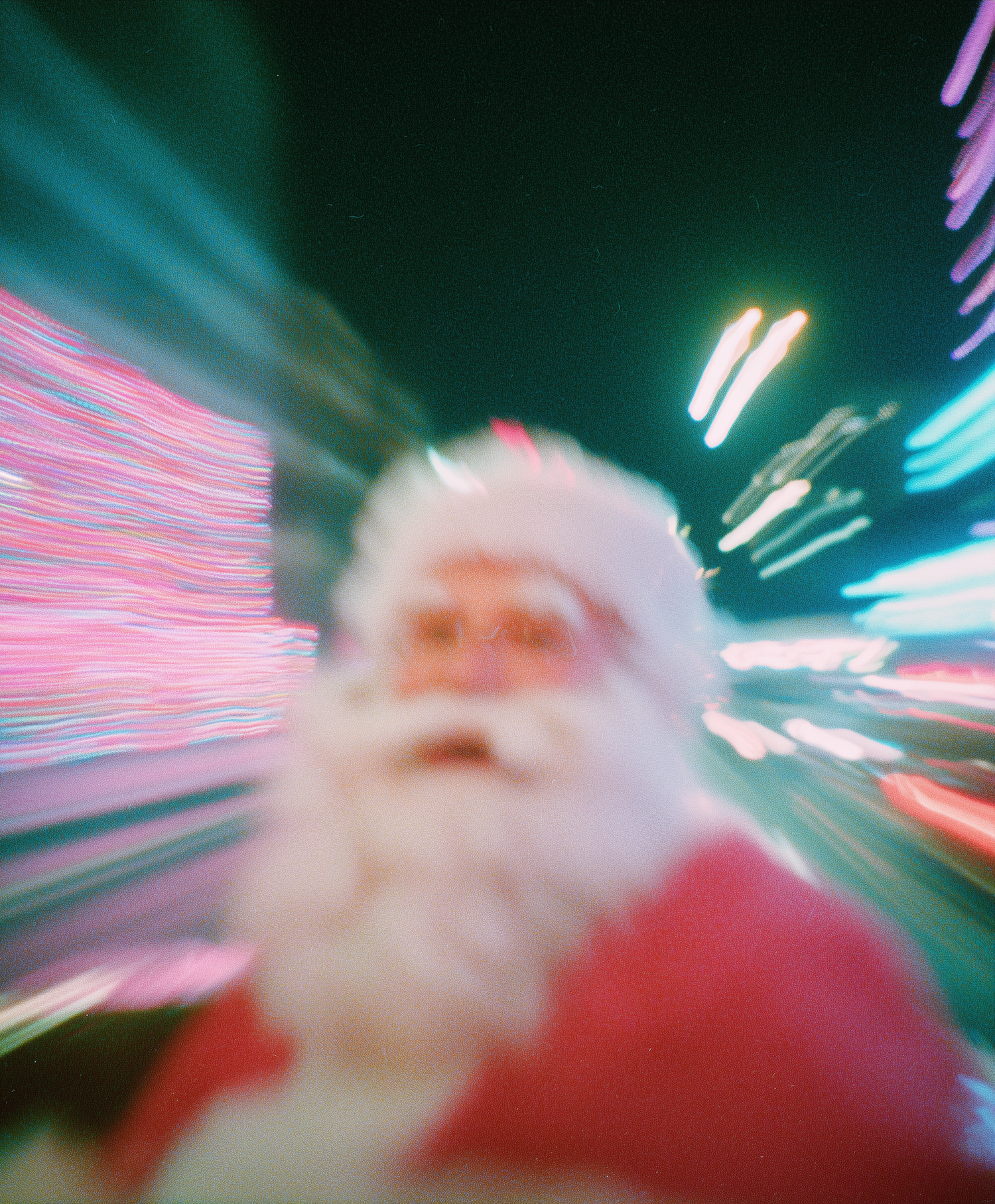 A blurred Santa Claus figure with vibrant streaks of light in a festive urban setting, creating a dynamic and colorful holiday atmosphere.