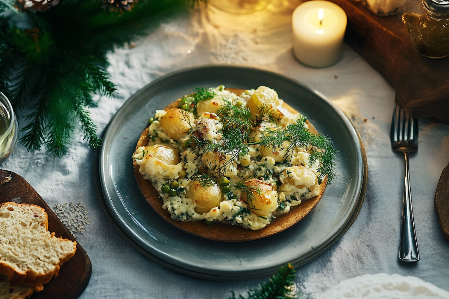 Rustic tart with roasted potatoes, cheese, and dill on a festive table setting with candlelight and evergreen decor.