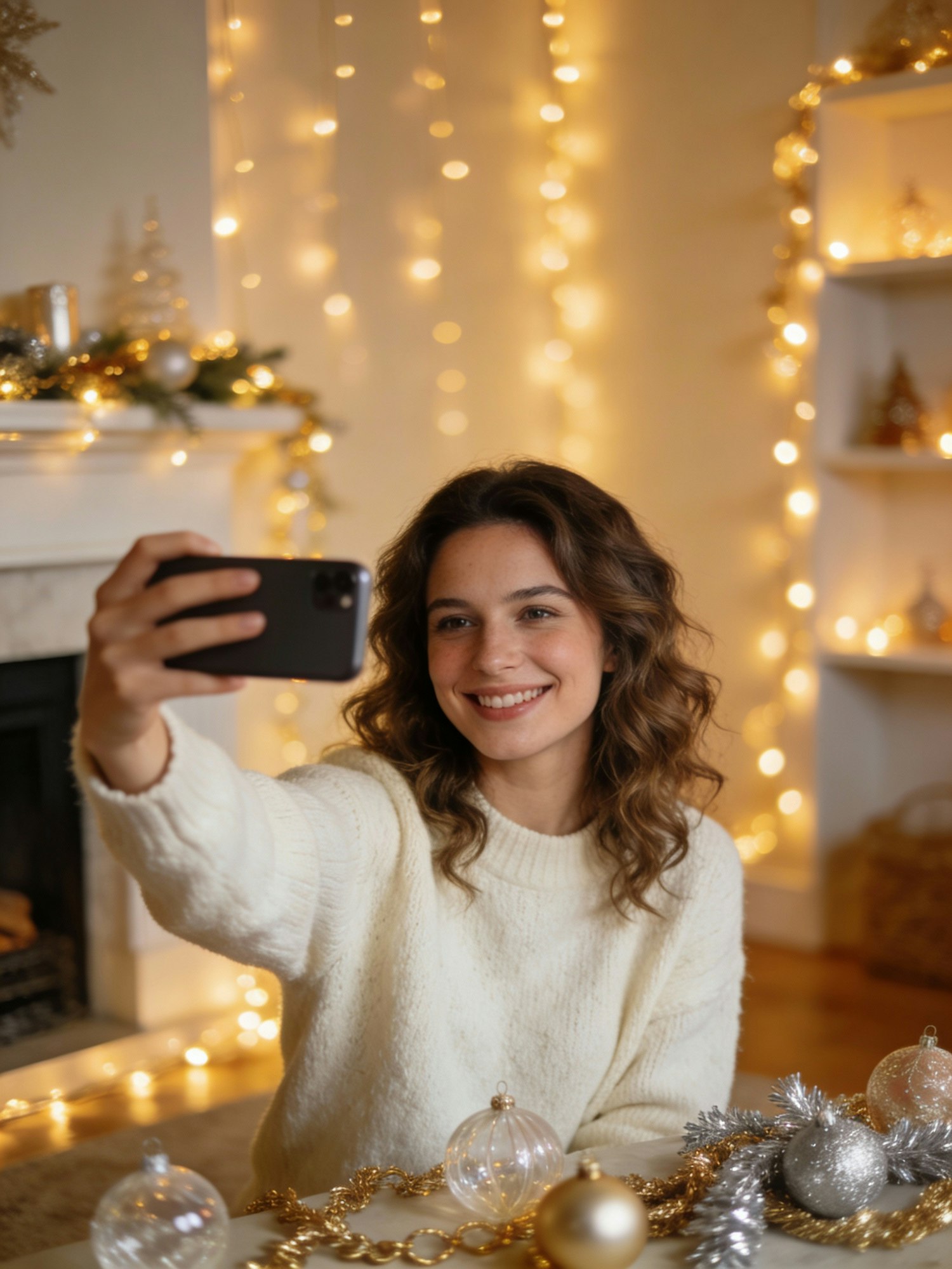 A cheerful woman in a white sweater takes a selfie surrounded by festive holiday decorations and warm string lights.