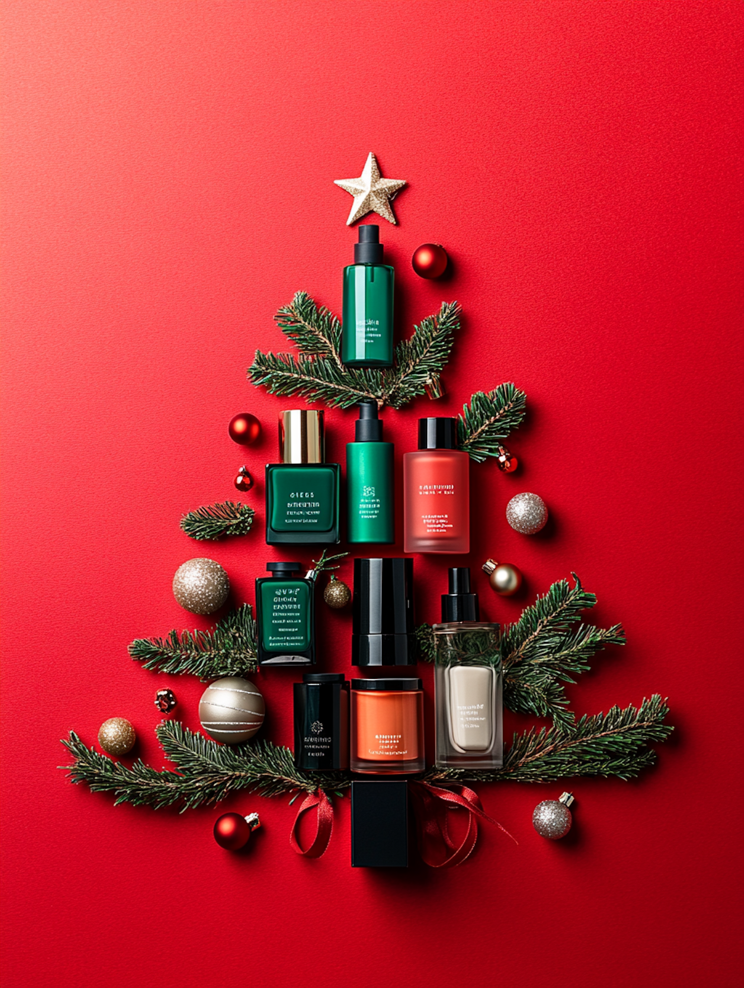 Festive skincare display styled as a Christmas tree with green bottles, pine branches, and ornaments on a red background.