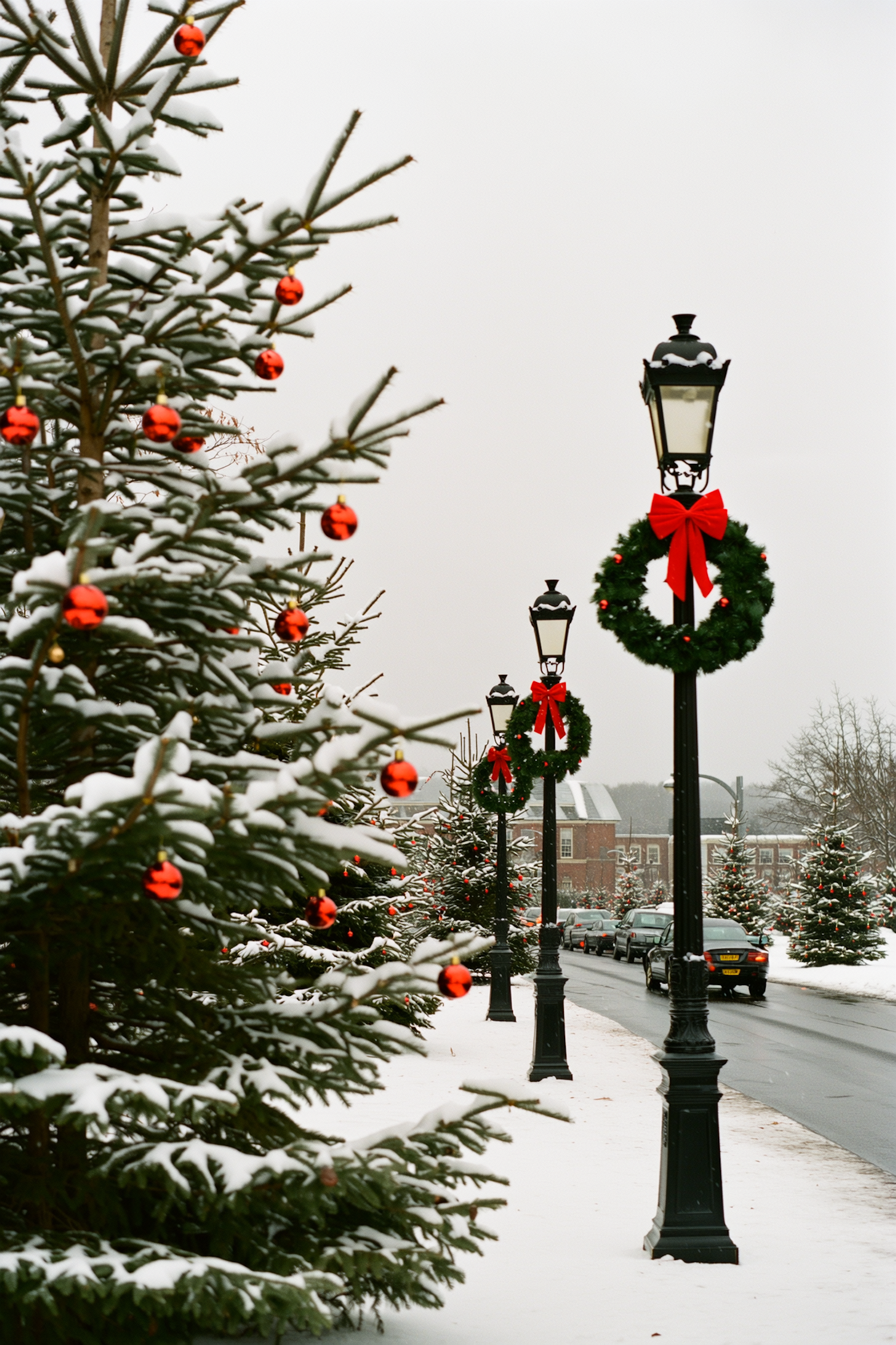 Snowy street with decorated trees, festive lampposts, and a cozy winter atmosphere.