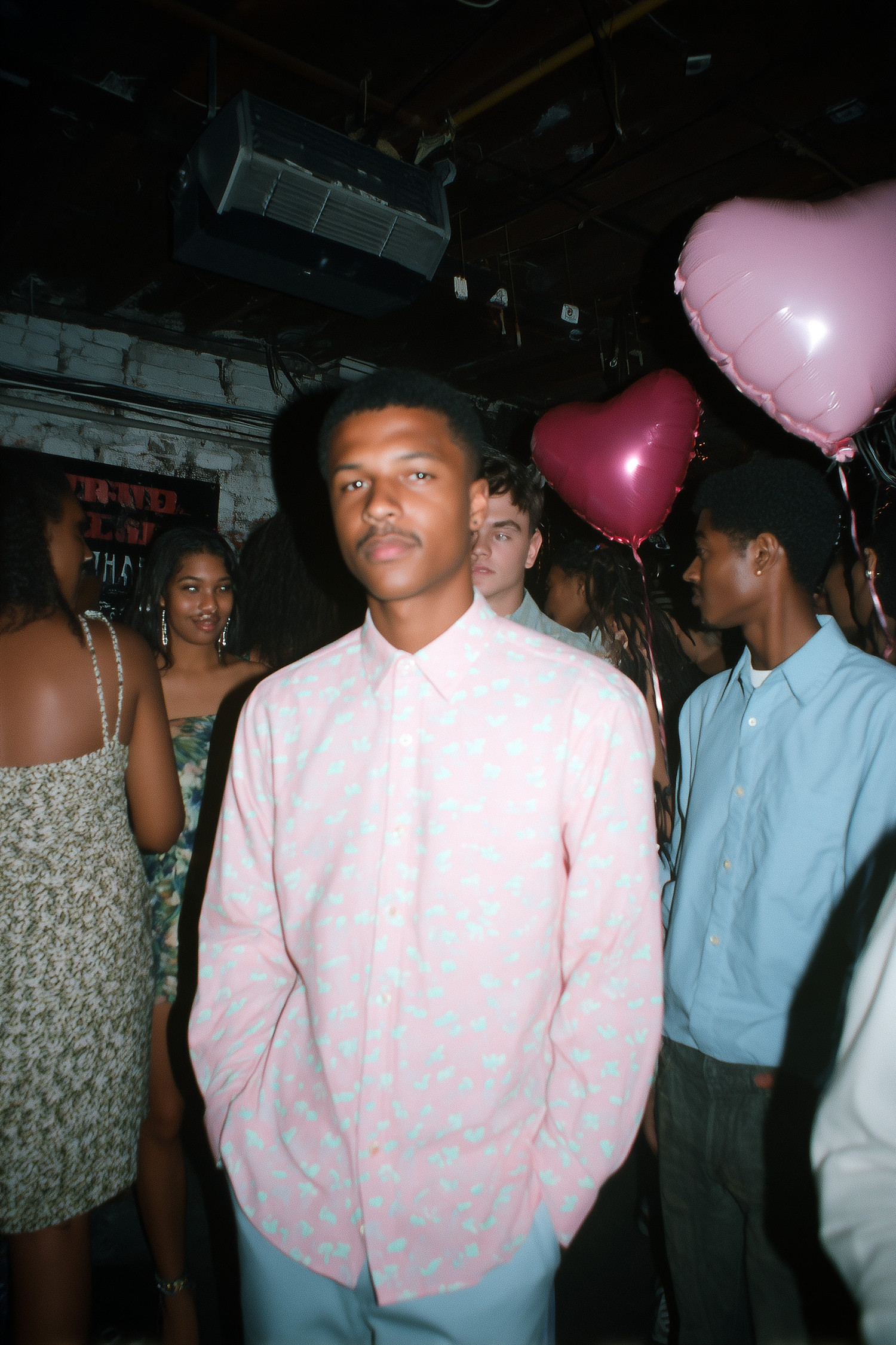 A lively indoor gathering with young individuals, featuring pink heart-shaped balloons and a festive atmosphere.