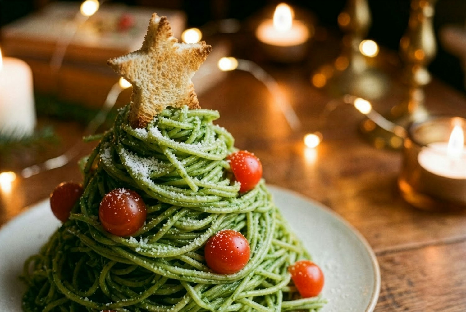 A festive Christmas tree made of pesto spaghetti, cherry tomatoes, and a toast star, set against a cozy candlelit background.