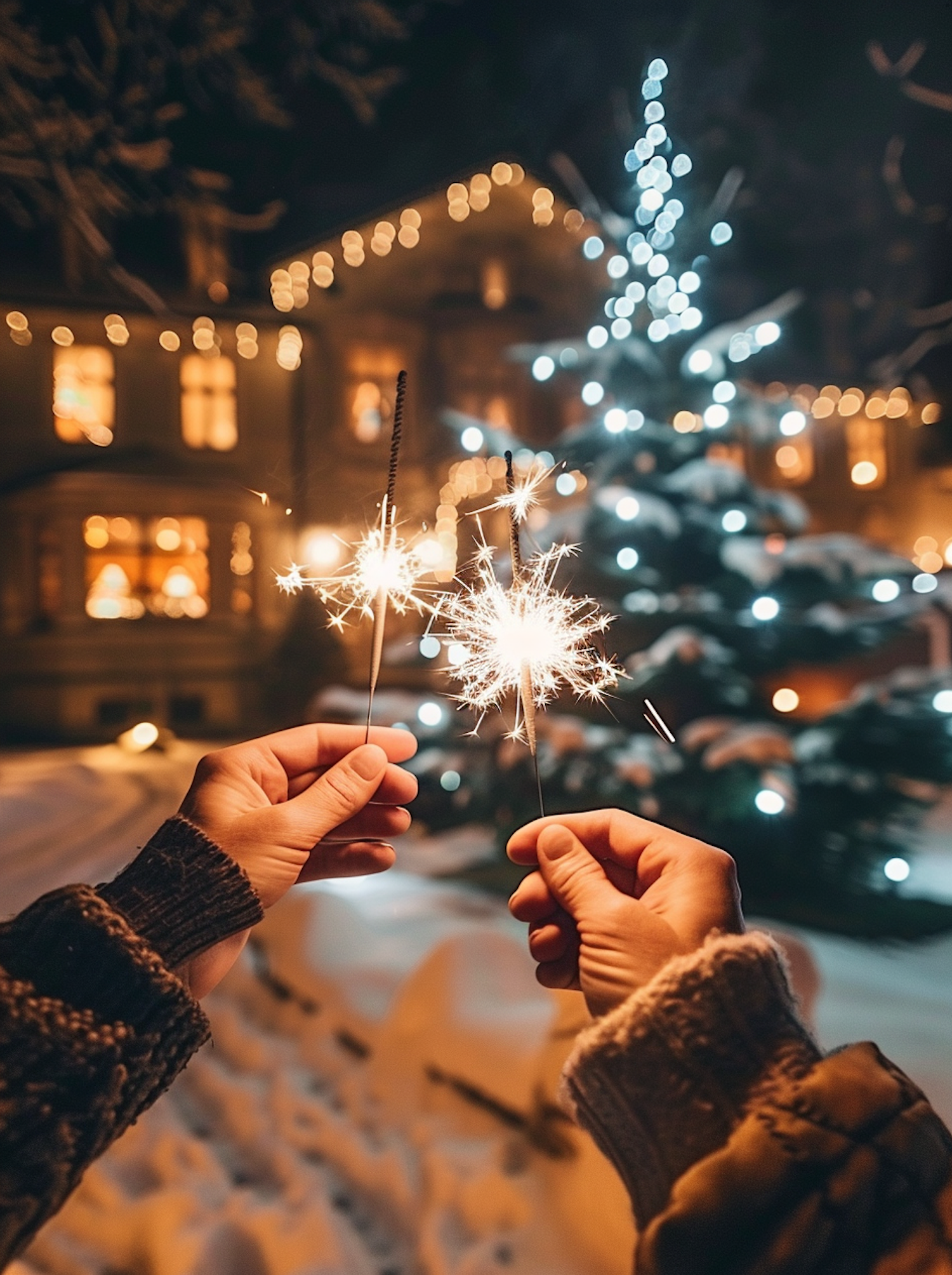 Hands holding sparklers in front of a lit Christmas tree and house, creating a festive winter scene with snow and warm lights.
