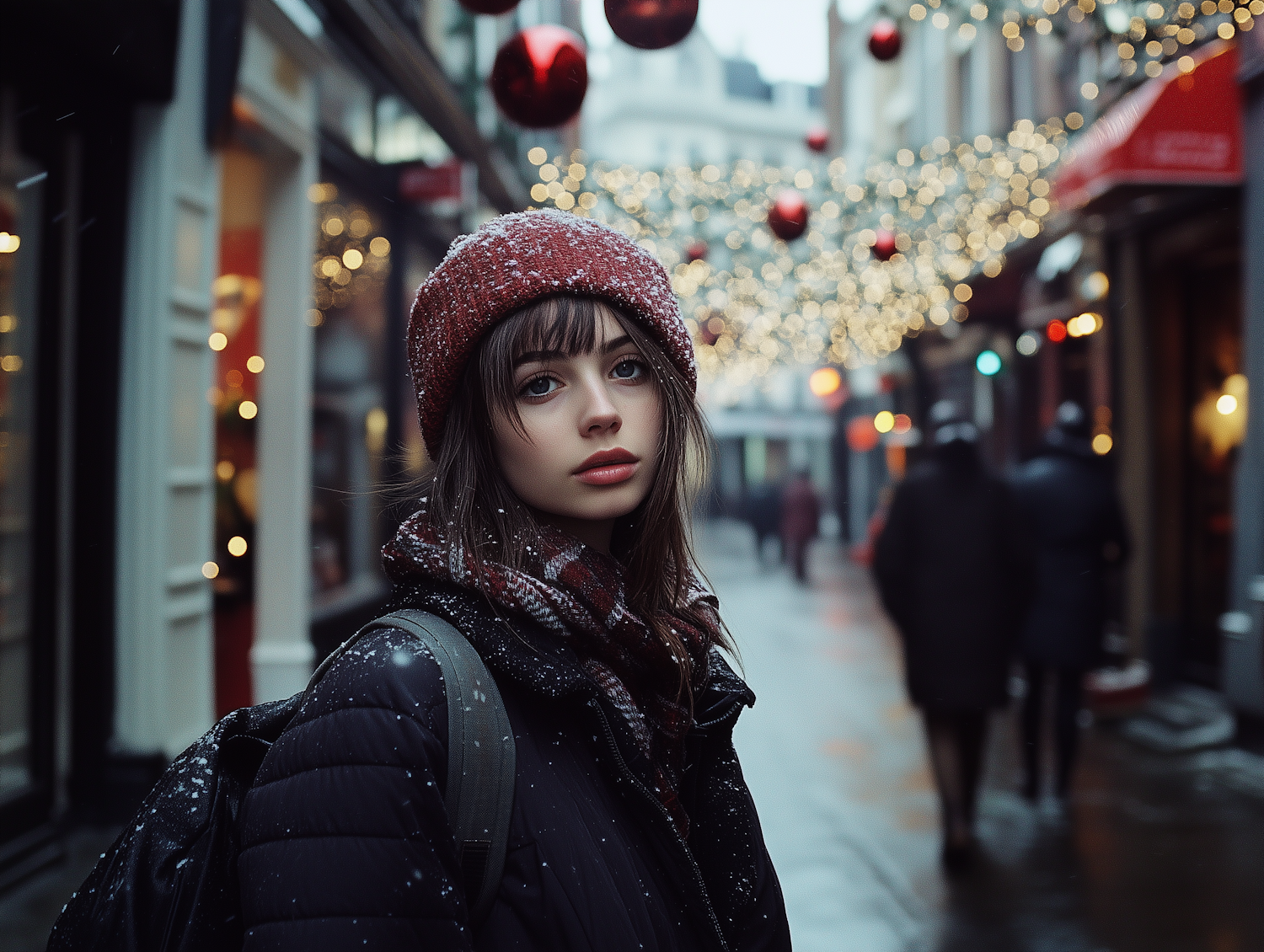 Young woman in a festive street with snow, wearing a red hat and scarf, surrounded by holiday lights and ornaments.