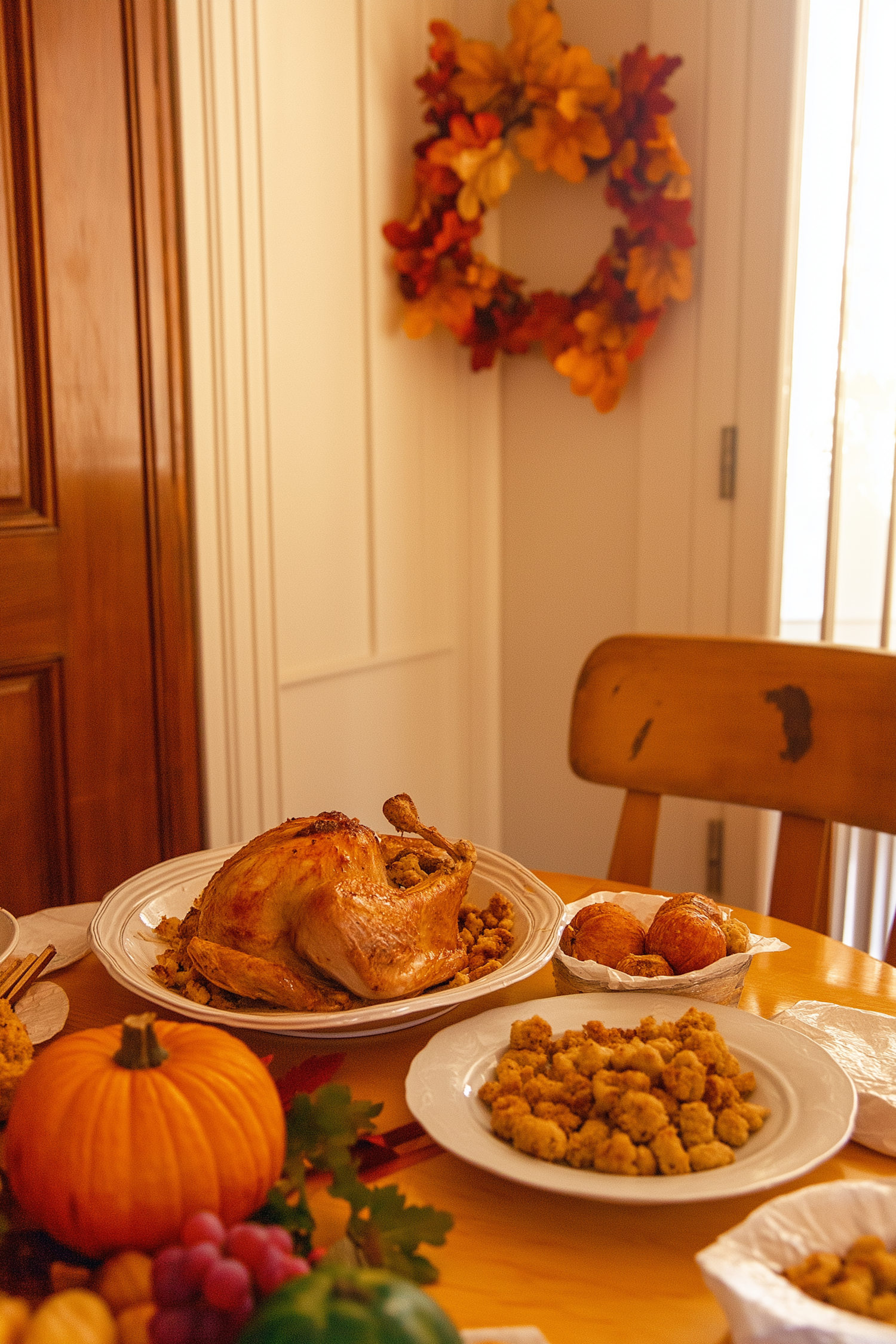 Cozy autumn dining scene with a roasted turkey, stuffing, and seasonal decor, featuring a leaf wreath and a small pumpkin.