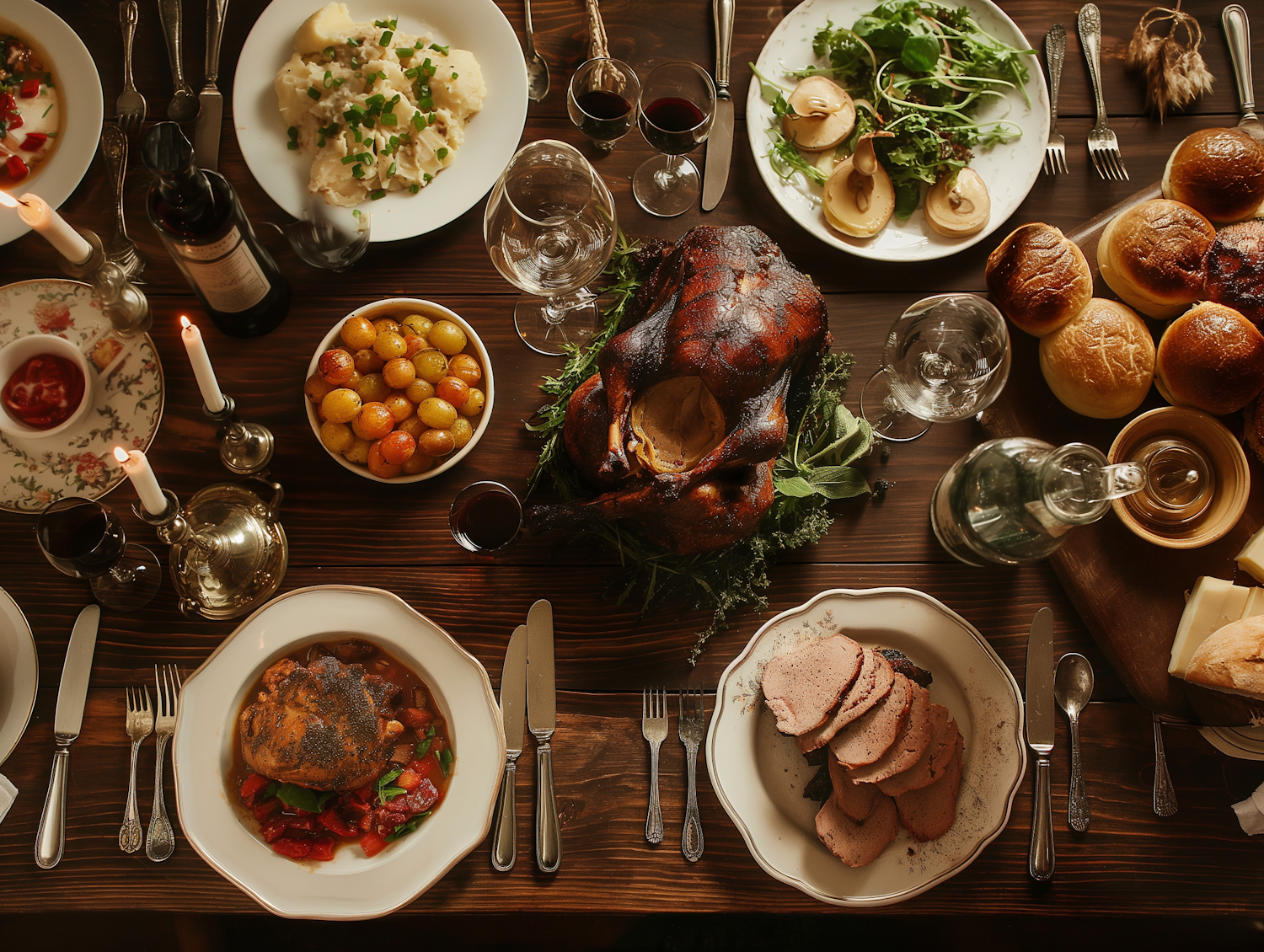 Elegant dinner table with roasted turkey, mashed potatoes, salad, and wine. Perfect for a festive gathering.